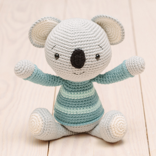 Wenn Du dasselbe Garn und dieselbe Häkelnadel verwendest wie ich, wird der Koala ca. 15 cm (5,9 Zoll) groß im Sitzen und ca. 20 cm (7,8 Zoll) stehend. Du kannst es größer oder kleiner machen indem du ein anderes Garn benutzt, passe aber dann die Häkelnadel und die Sicherheitsaugen entsprechend an.