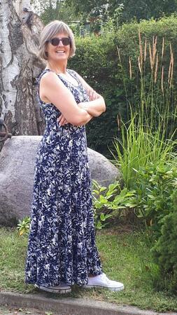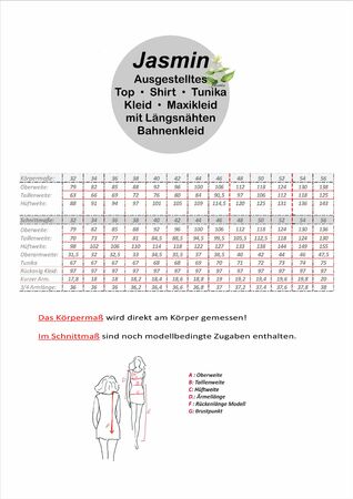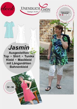 Ein schwungvoller, lässiger, sehr variantenreicher Schnitt, der durch die Längsnähte geradezu einlädt, fast jede Bahn aus einem anderen Muster, Stoff, oder andern Kombinationen zu nähen. Der Schnitt kann als Top, Tunika, Kleid und Maxikleid, ohne oder mit kurzen oder 3/4 Arm genäht werden. Der Einfachheit halber wird die Variante Kleid lediglich um 40 cm verlängert, wodurch sich die Länge des Maxikleides ergibt. Dieser Schnitt ist bereits getestet, Designbeispiele sind vorhanden, für Design Anita Lüchtefeld unter dem Label UnendlichSchön Den Schnitt gibt es in Doppelgrößen von 32 - 56 „Jasmin“ lässt sich herrlich bequem tragen. Es schmiegt sich in komfortabler Weite an die Figur an, ist aber dennoch schlicht schöner Chic. Dieser hervorragende Schnitt hat für euch durch seine Vielfältigkeit und seinen Variantenreichtum wieder den von mir gewohnten Mehrwert und ist - je nach Material und Farbe - ein variabler Begleiter durch das gesamte Jahr. Es lässt sich hervorragend mit schmalen Hosen oder auch Leggins und Marlene-Hosen kombinieren.
