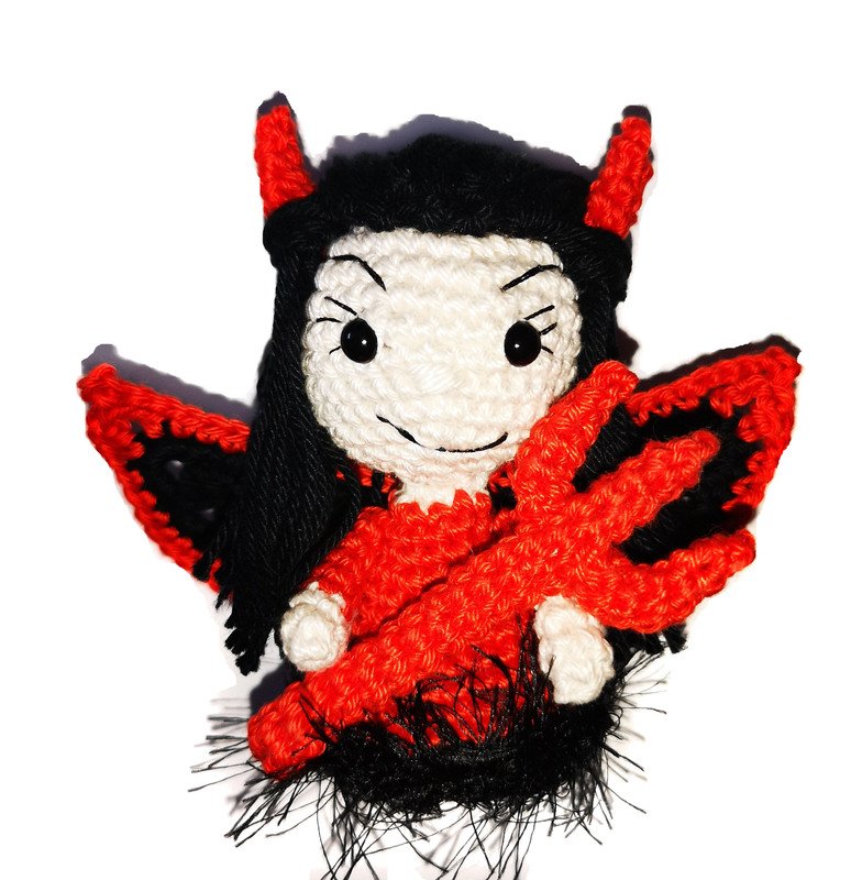 Engelchen und Teufelchen haben nach dieser Anleitung eine Höhe von ca. 10cm und eine Breite von ca. 11cm mit ausgespreizten Flügeln.