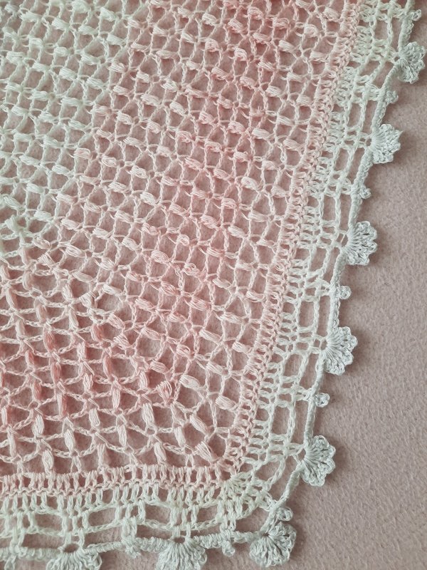 Das pastellfarbene Tuch ist mit nur 2-fädigem Garn gehäkelt und besonders leicht.