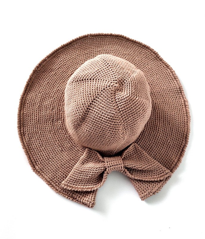 This is a crochet hat in a floppy design with an extra-wide brim and bow of the back.