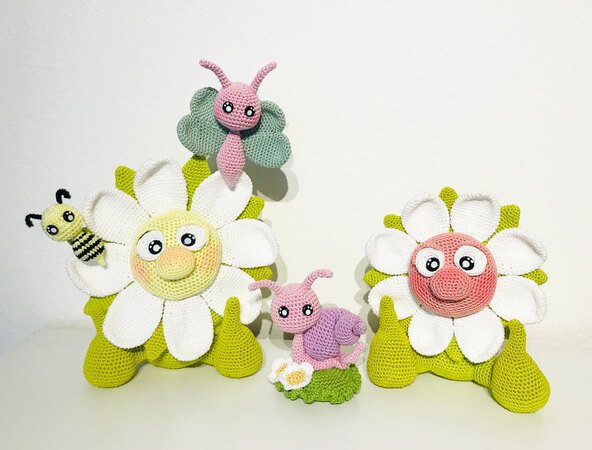 Mit dieser Anleitung erkläre ich Euch Schritt-für-Schritt, wie Ihr die niedlichen Zauber-Blumen mit Schmetterling, Schneckchenwiese und kleiner Biene nachhäkeln könnt.