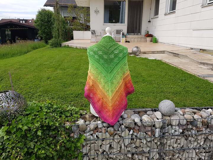 Die Anleitung ist ausführlich schriftlich formuliert, sodass sogar Anfänger dieses riesige Dreieckstuch mit flacher Kante arbeiten können.