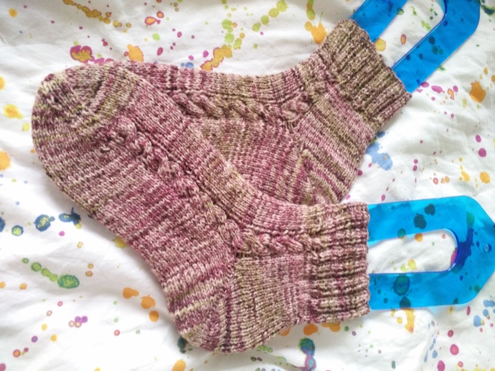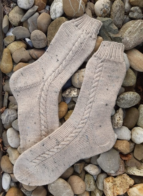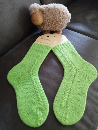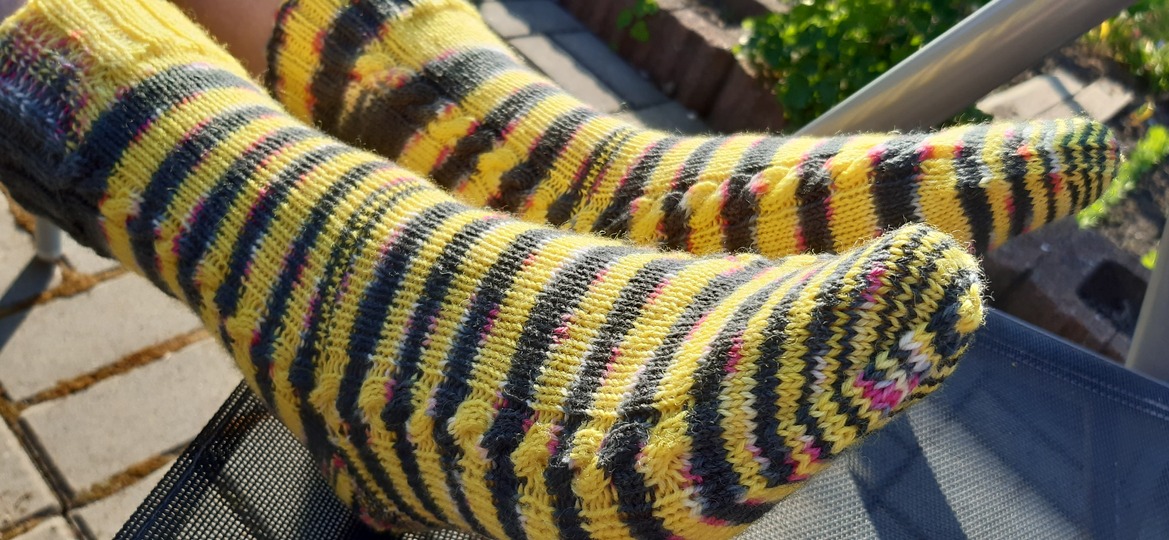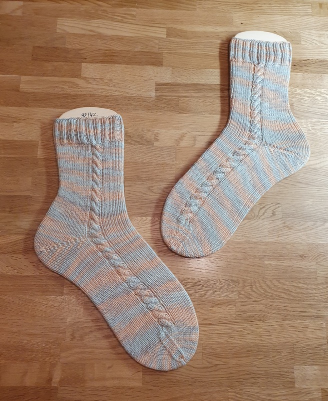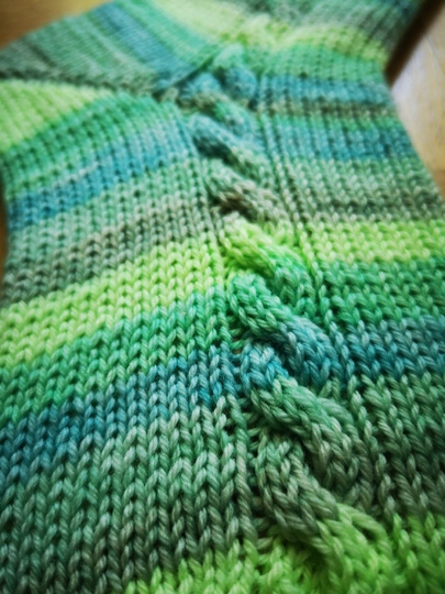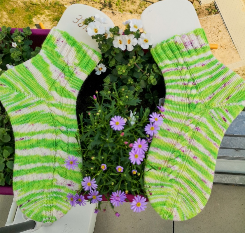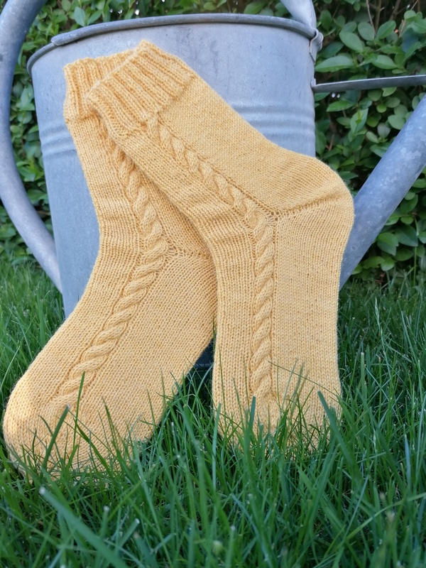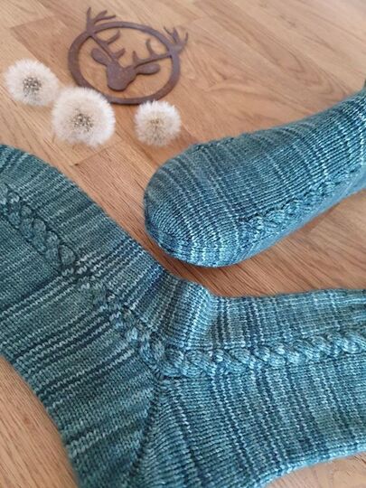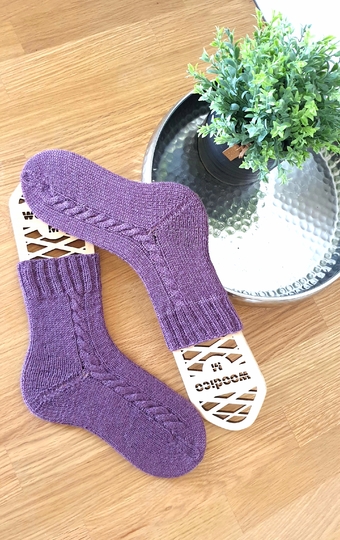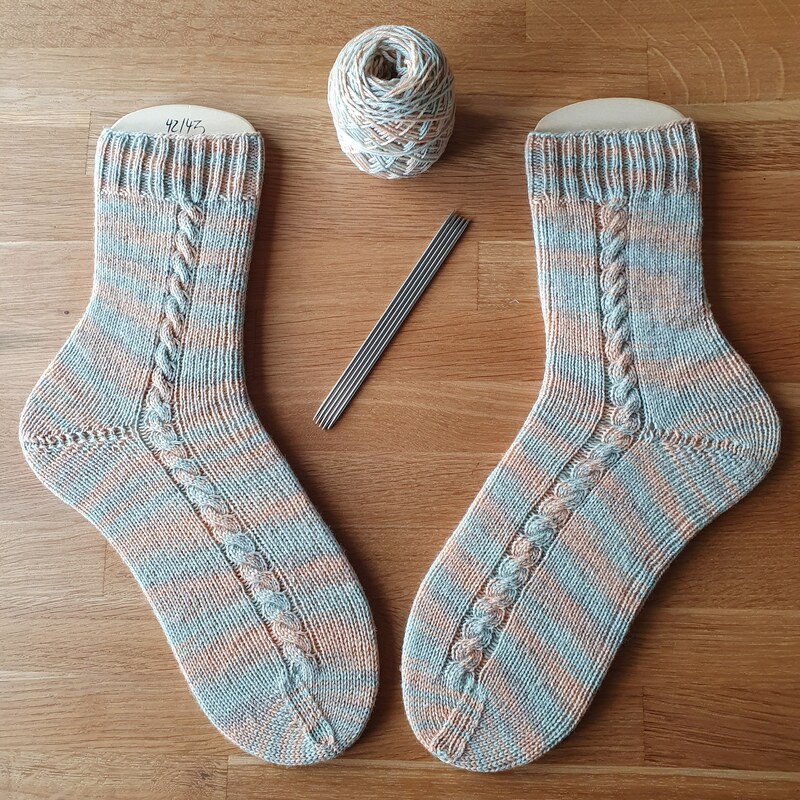 Die Anleitung „Doppelzopf“ ist eine Sockenanleitung mit einem Zopfmuster. Dieses zieht sich auf beiden Seiten des Fußes bis ganz nach unten. Das engmaschige Zopfmuster neigt sich dabei jeweils zur Mitte hin.