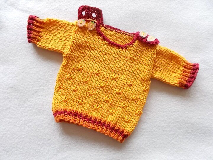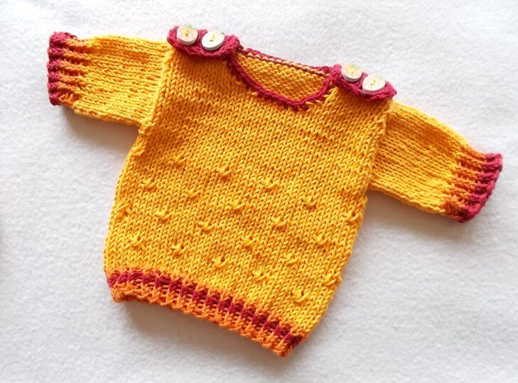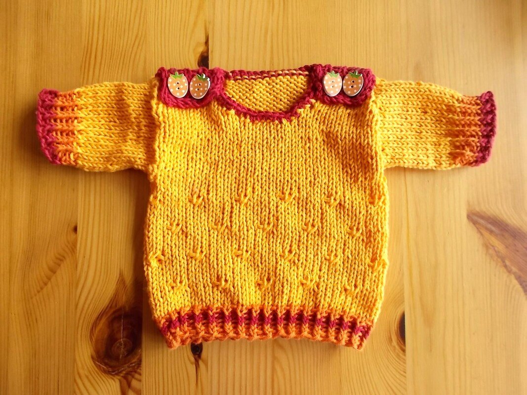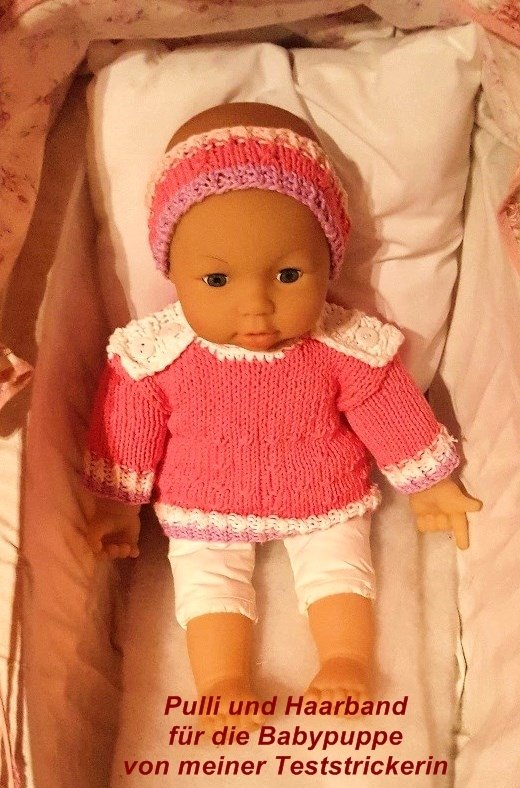 Alle Teile sind aus dünner leichter Baumwolle gestrickt, somit auch gut waschbar. Oben hat das Röckchen ein Bindeband. Dazu gibt es einen passenden Pulli, der sowohl mit langen als auch mit kurzen Ärmeln gestrickt werden kann. Der Pulli hat keine Nähte. Der Halsausschnitt ist umhäkelt.