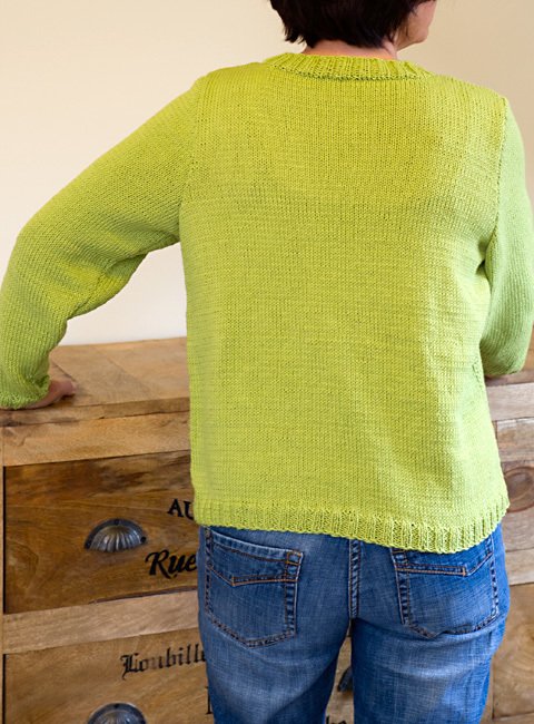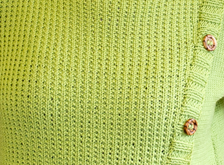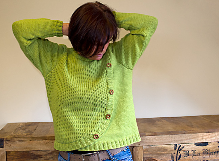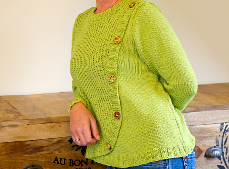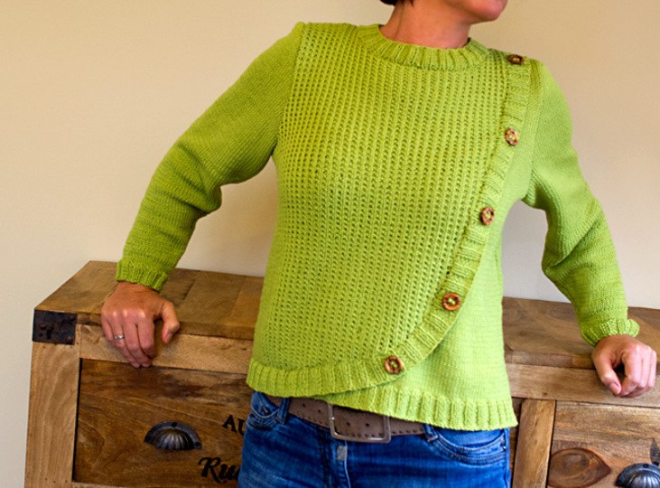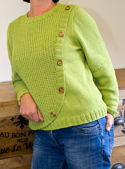 Strickanleitung für einen Pullover mit Knopfleiste. Beide Vorderteile werden zunächst getrennt gestrickt und erst nach dem Anstricken der Knopfleiste zusammengenäht. Das Vorderteil ist also nicht tatsächlich geknöpft, die Knöpfe werden lediglich auf die Leiste und das linke Vorderteil genäht.
