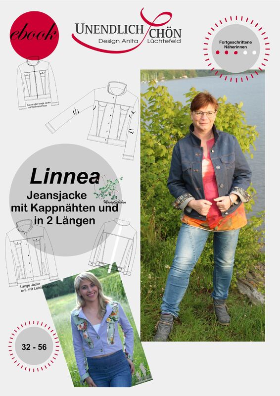 Ein exklusiver Jeansjackenschnitt in zwei Längen, in den Größen 32 – 56, mit original Kappnähten. Die Nähte und Kappnähte sind bereits im Schnitt enthalten, also optisch dargestellt! Des Weiteren ist im Schnittmuster eine Variante mit Reißverschluss eingezeichnet. In der langen Version können in die Vorderteile auch Leistentaschen eingearbeitet werden. Wieder ein Schnitt mit dem von mir gewohnten Mehrwert, der sich auszahlt!