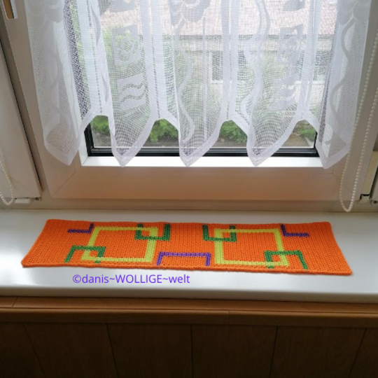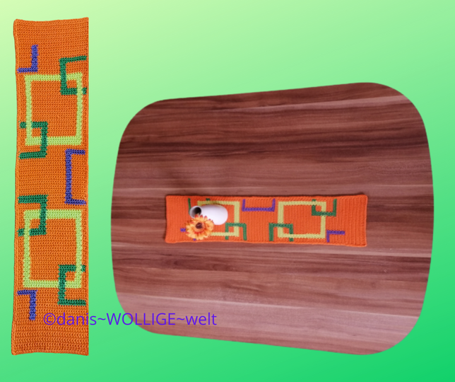 Mit genannter Baumwolle und Häkelnadel wird das Tischband 56 cm x 13 cm groß