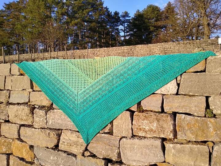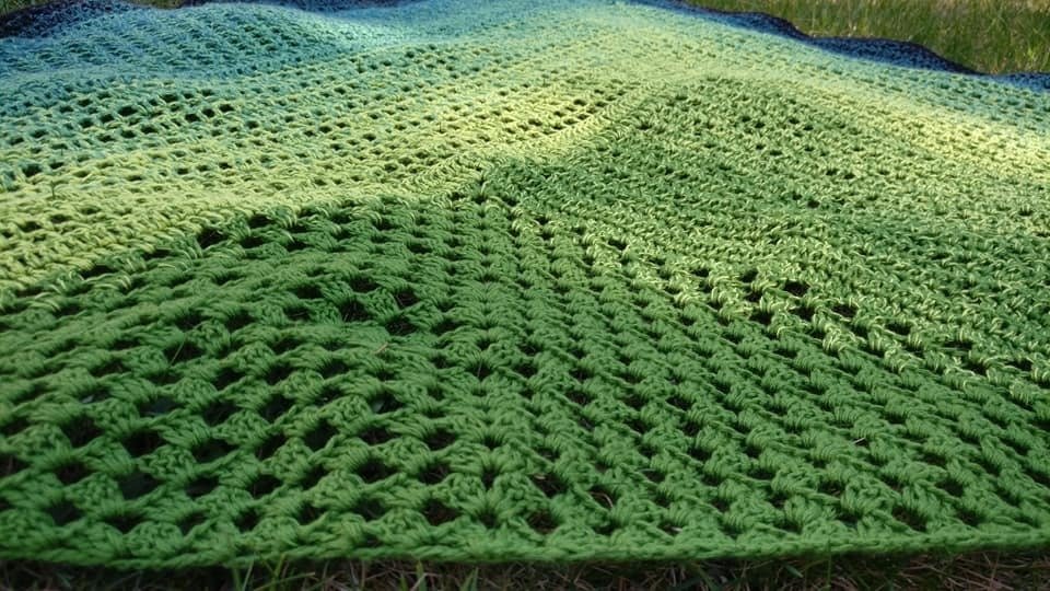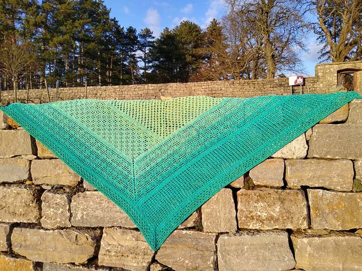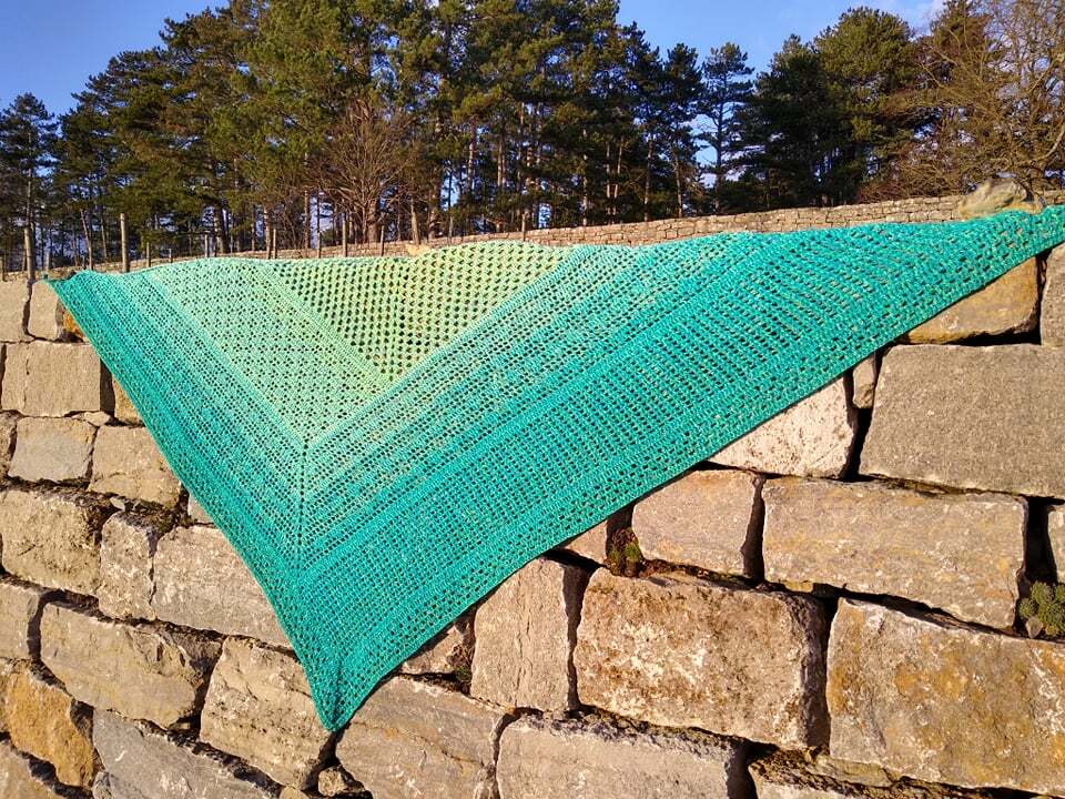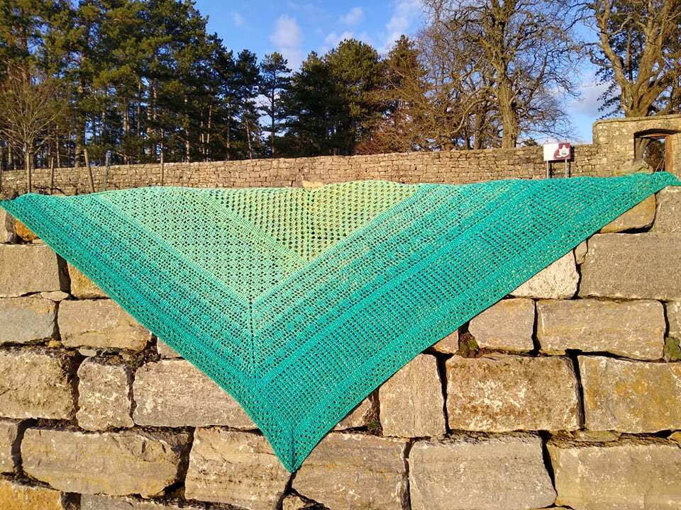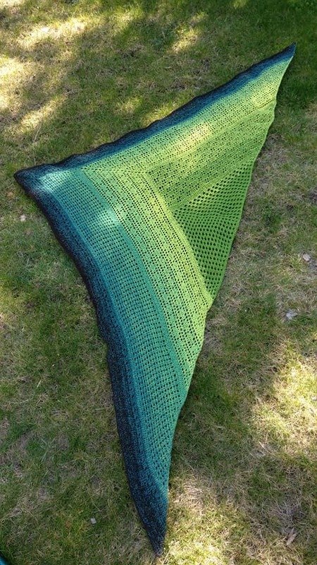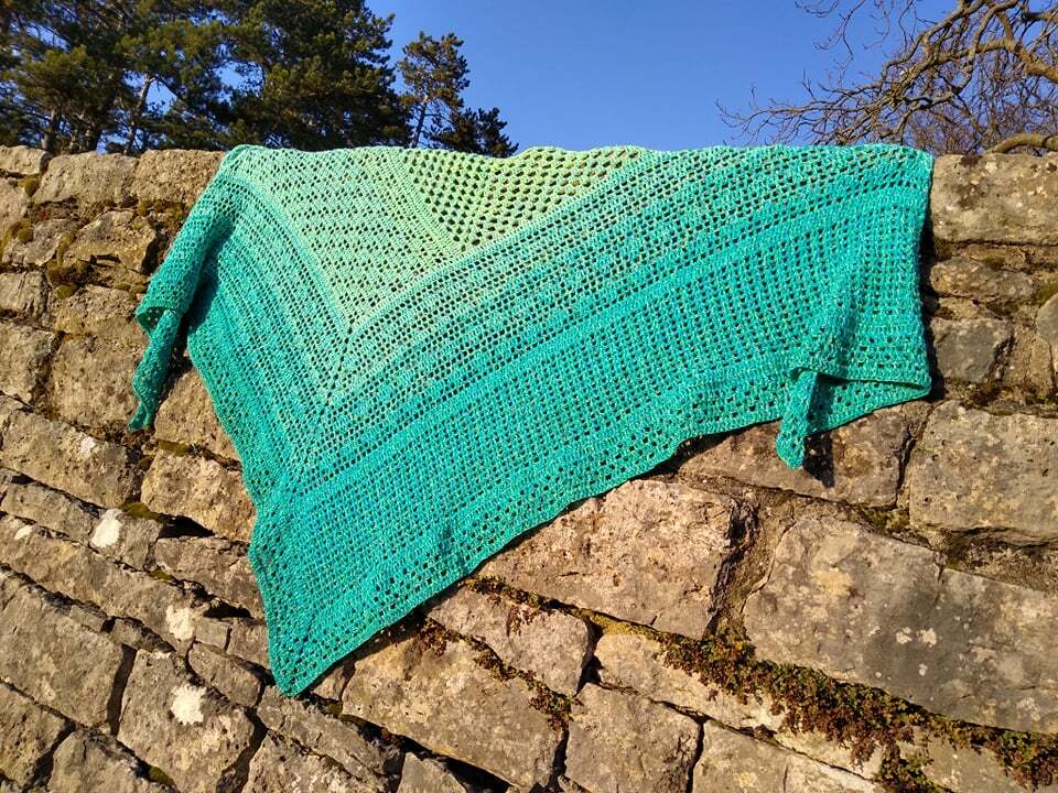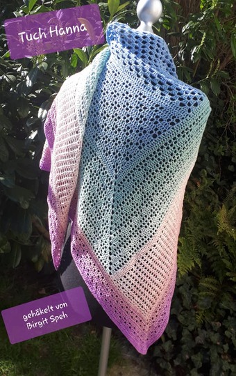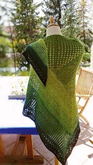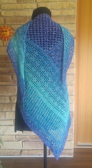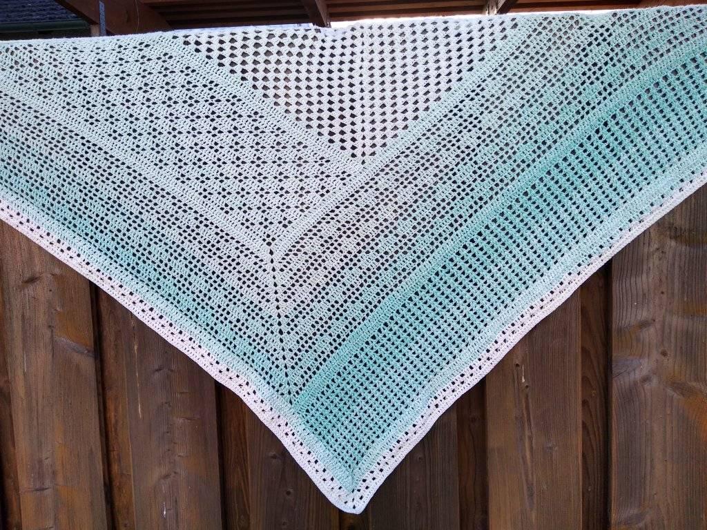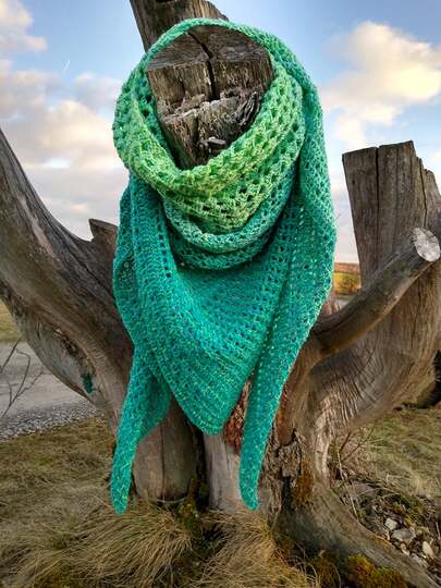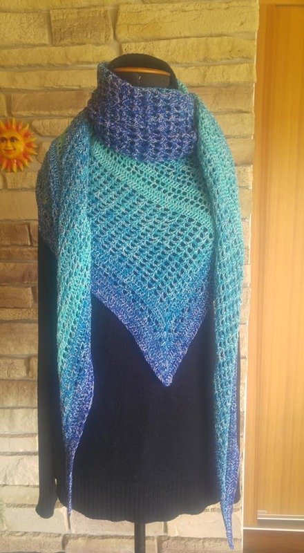 Mein Tuch hat eine Spannweite von circa 2,0 Metern. Die Größe kann jedoch variieren, je nachdem welches Material verwendet wird, bzw wie fest oder locker man häkelt.