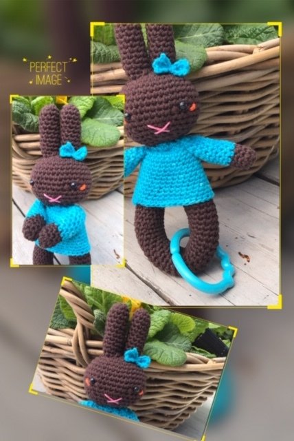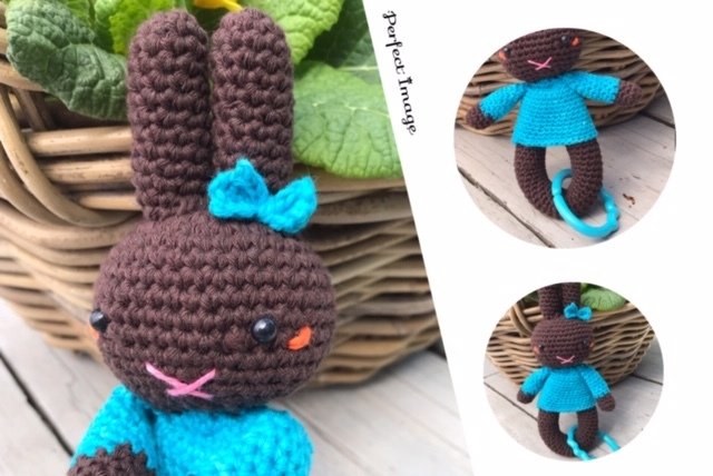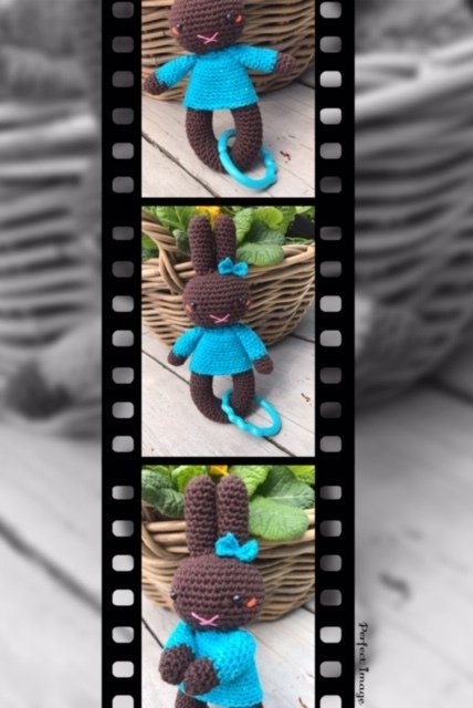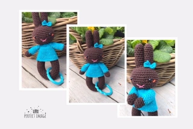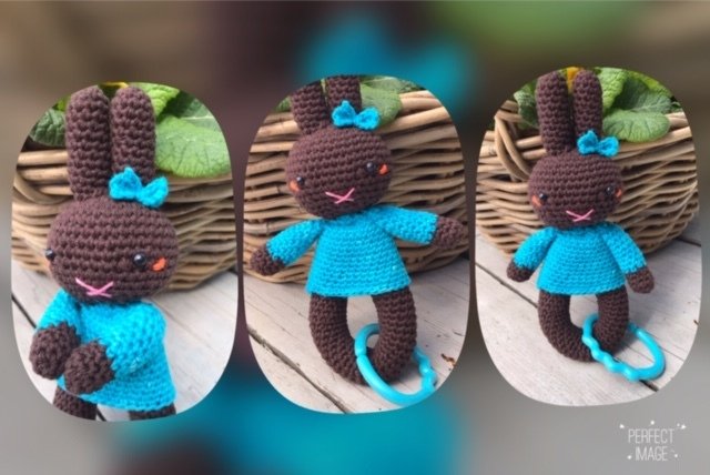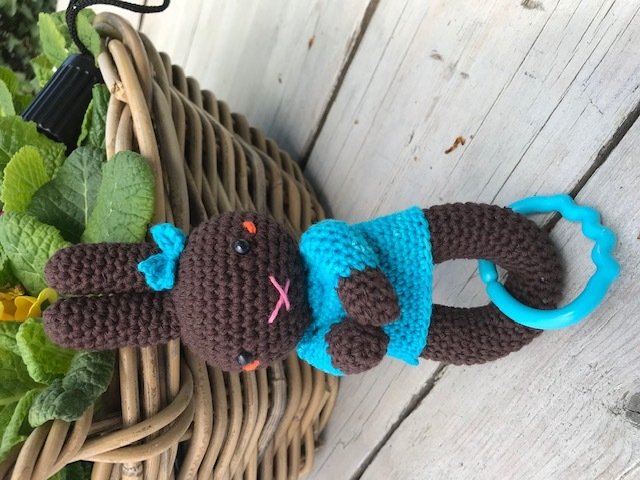 Cotton in two colors: brown and blue, safety eyes, rattle, silicon or wooden ring