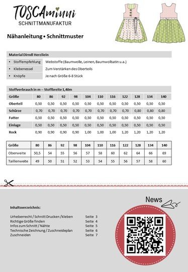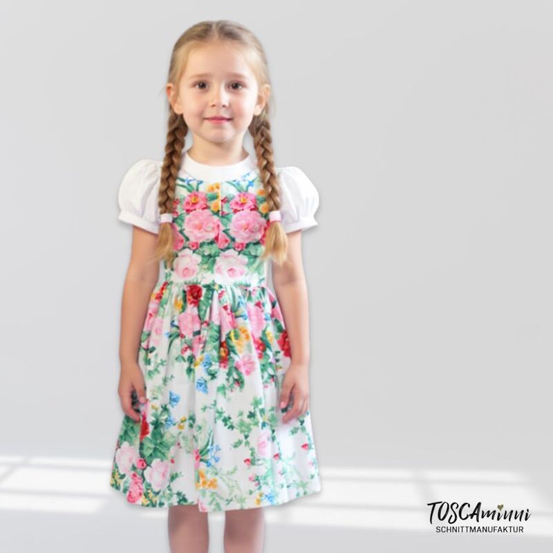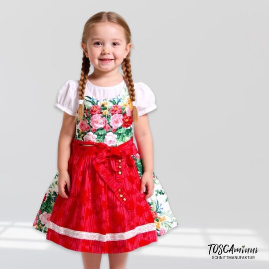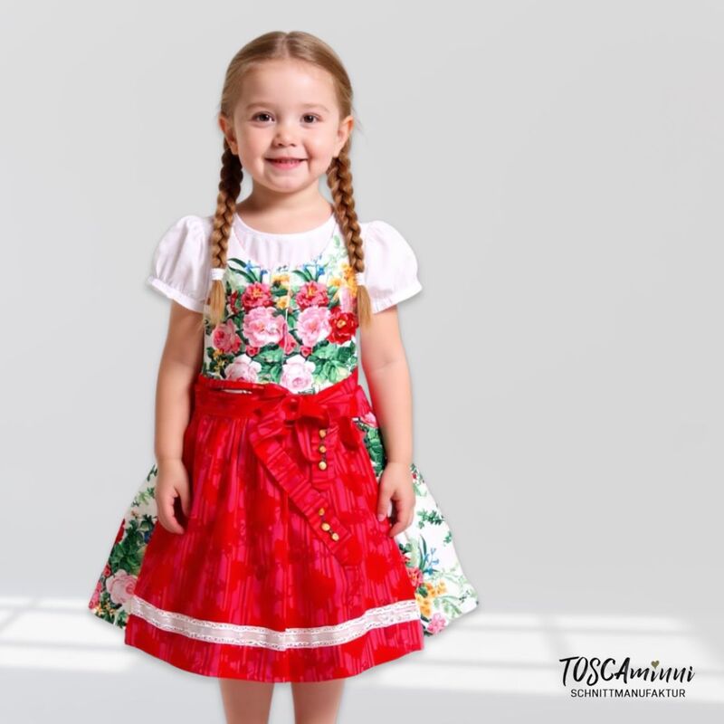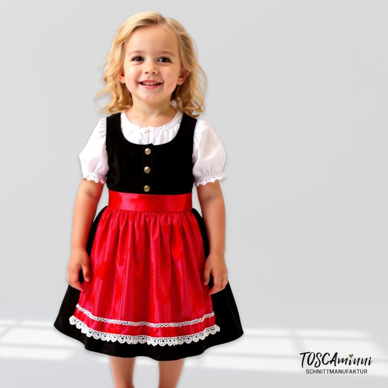 Süßes Schnittmuster inkl. Nähanleitung für ein Kinderdirndl. Der Schnitt besteht aus Obereil/Rock und Schürze. Es erfordert etwas forgeschrittenere Nähkenntnisse, jedcoh solltest Du auch als Nähnfängerin noch gut zurechtkommen. Für das Dindl benötigtst Du nur Stoffreste. Es ist einfach konzipiert, so dass Du gut opulente Verzierungen anbringen kannst, z.B. Froschgoscherl.