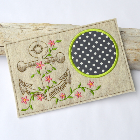 Stickdatei Mug Rug mit Anker und Blumen.