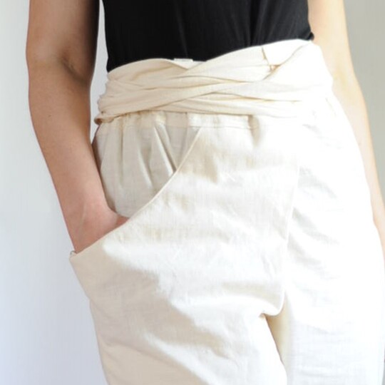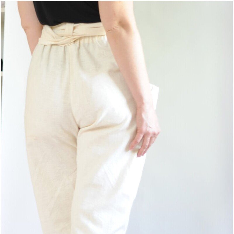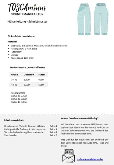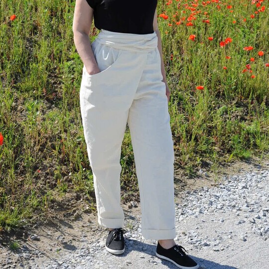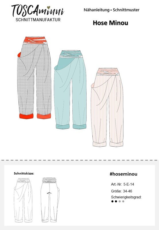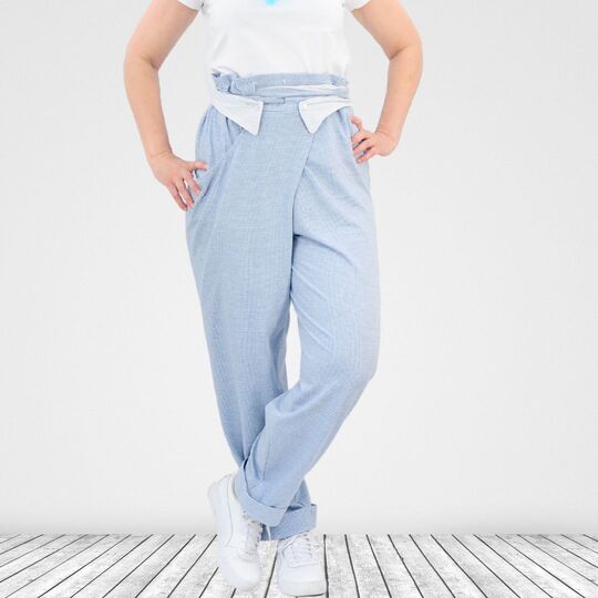 Mit der Sommerhose Minou im Paperbag-Stil machst Du mit Sicherheit eine gute FIgur. Der Bund ist hoch ansetzt und wird mit einem Gummiband genäht. Um die Wickeloptik zu verstärken ist der Gürtel extra lang zum Binden, so dass sie wie eine Paperbaghose wirkt. Die Hose kann gekrempelt werden so kannst Du sie auch im 7/8-Look tragen. Es sehen sowohl Pumps als auch Turnschuhe gut dazu aus.