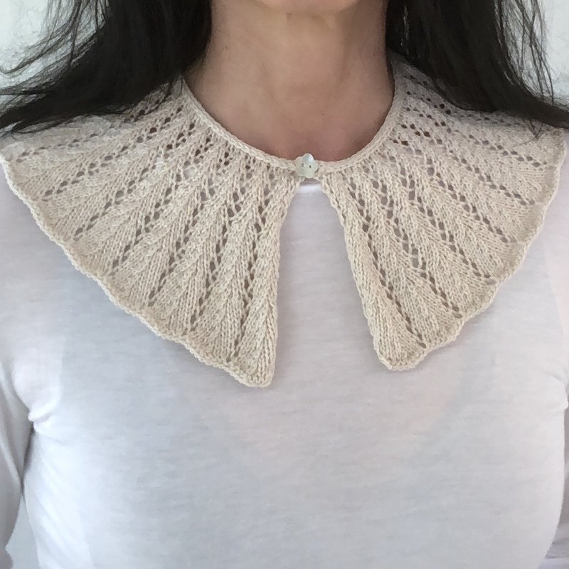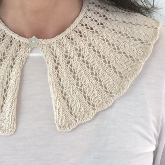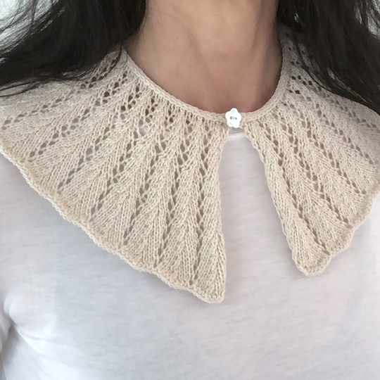Der Strickkragen wird von unten nach oben zum Hals durch Abnahmen in den jeweiligen Musterabschnitten gestrickt. Am Ende beim Halsausschnitt wird mit einem I-Cord-Rand (oder mit der einfachen Variante durch normales Abketten) abgenommen. Dem Kragen ziert vorne in der Mitte ein kleines Knöpfchen, mit welchem der Kragen geschlossen wird.