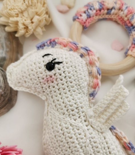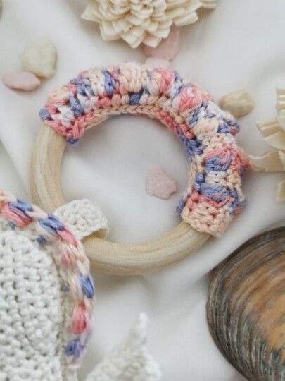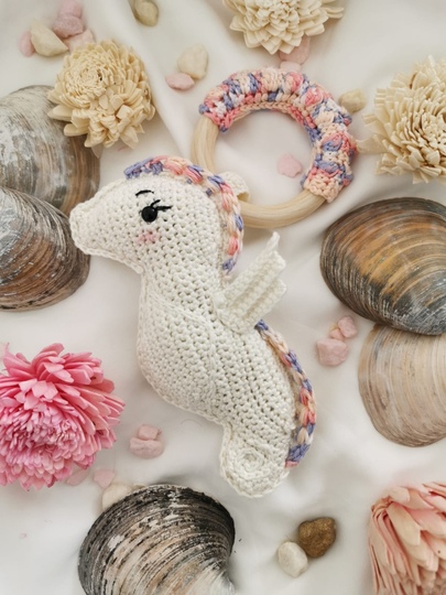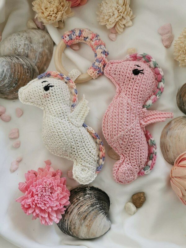 Mit Hilfe dieser umfangreichen Anleitung kannst du, dass tolle Seepferdchen nacharbeiten. Du kannst es mit einem Holzring als Babyrassel/ Greifring benutzen oder ganz einfach ohne Holzring als Kinderspielzeug, Vielleicht magst du auch gerne maritime Deko, dann eignet sich das Seepferdchen natürlich auch einfach als Dekoelement in deiner maritimen Sammlung.