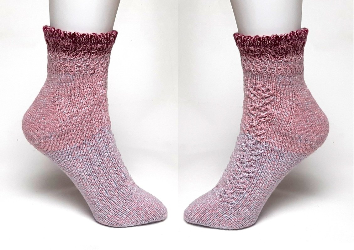 Teil 1: 5. Juni 2020, die Spitze, der Fuß bis Fersenbeginn, wahlweise mit Muster oder ohne, Größentabelle mit den Angaben zu den Zu- und Abnahmen, Textanleitung (Rundenweise, Video und Strickschrift)