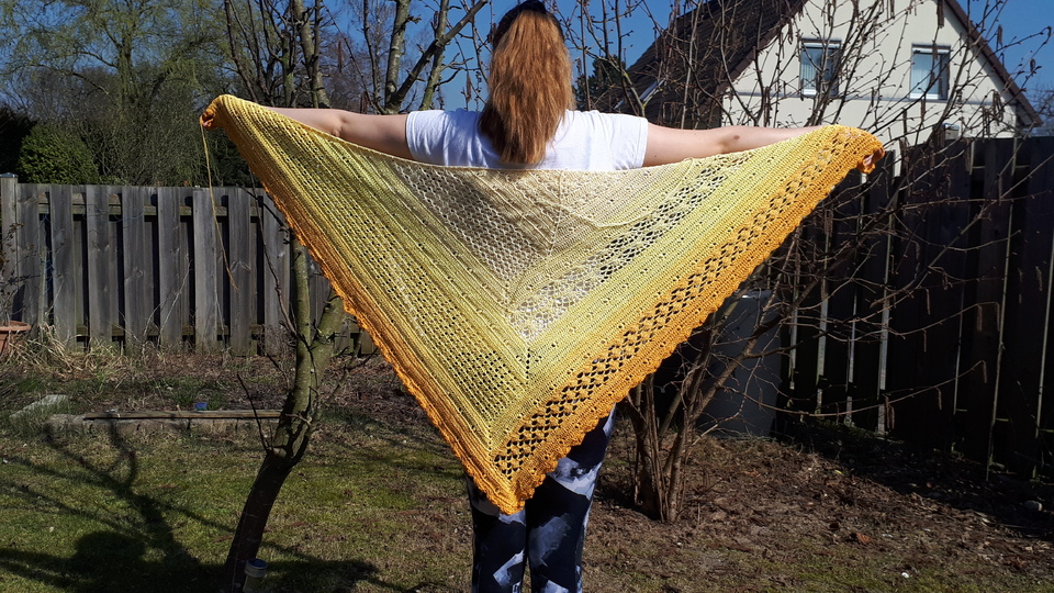 Mein Tuch hat eine Spannweite von 190 x 90 cm bei 1120m / 3fädig, gearbeitet mit NS 3,0