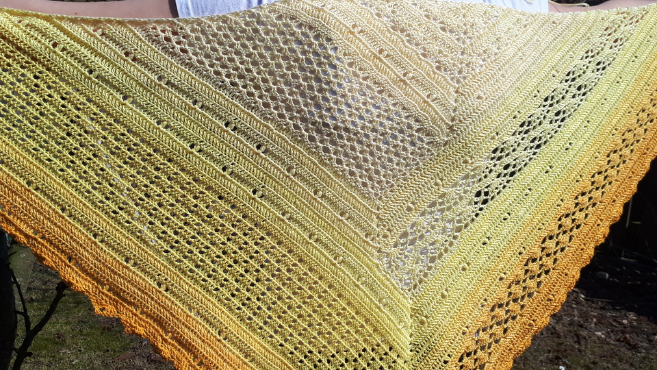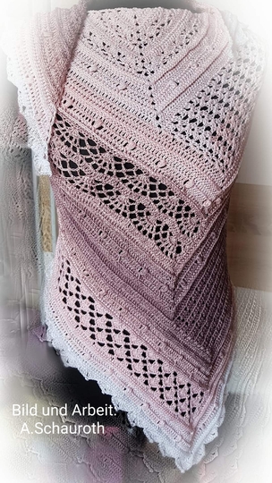 Das Tuch besteht aus Luftmaschen, Feste Masche, Stäbchen, Doppelstäbchen, vordere Reliefstäbchen und Büschelmaschen.