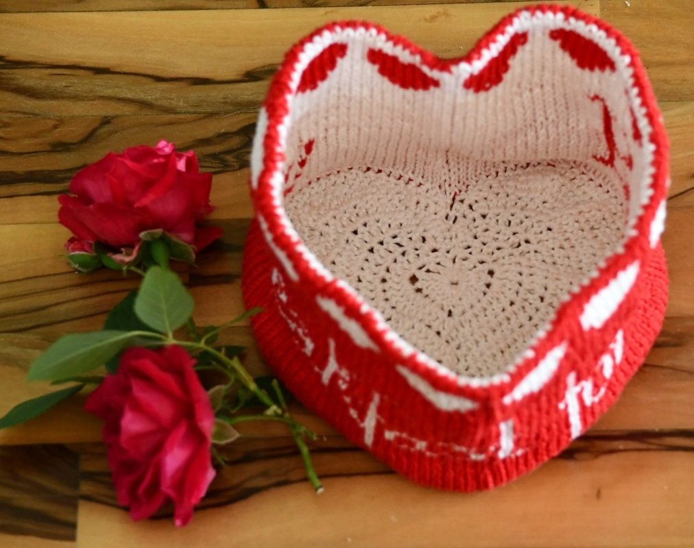 Der herzförmige Boden des Körbchens wird gehäkelt, die Korbwand wird in Doubleface gestrickt. In der Anleitung gibt es neben der klassischen Doubleface Variante auch eine erweiterte Version, in der die Schrift auf beiden Seiten richtig herum erscheint! Damit kann der Korb sogar beidseitig verwendet werden.