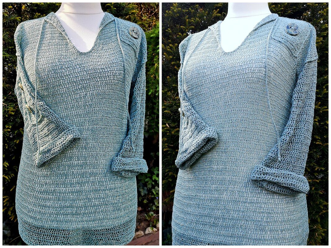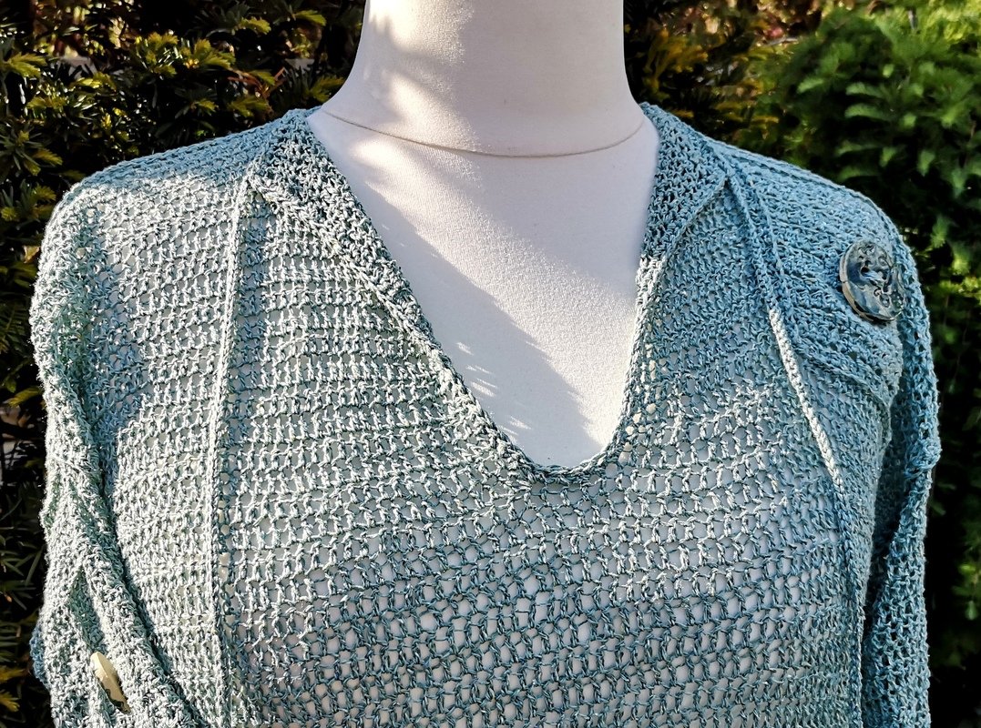Das hier abgebildete und beschriebene Netzshirt wurde für Größe 42/44 (Brustumfang ca. 105 cm, Hüftumfang ca. 108 cm) gearbeitet.