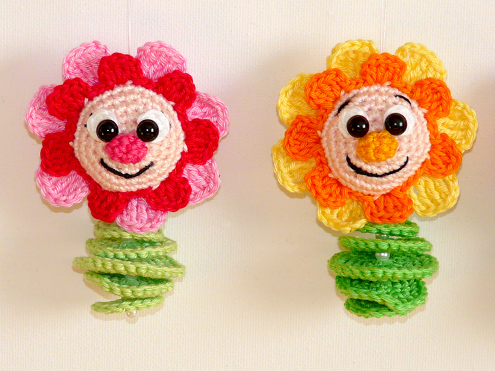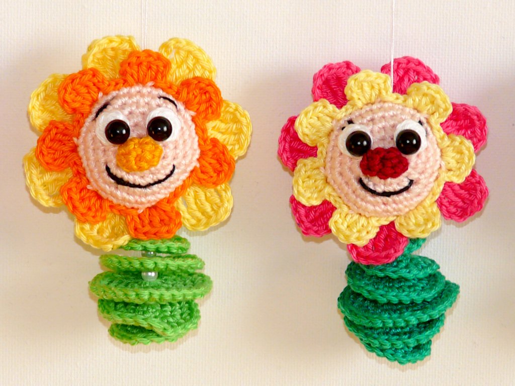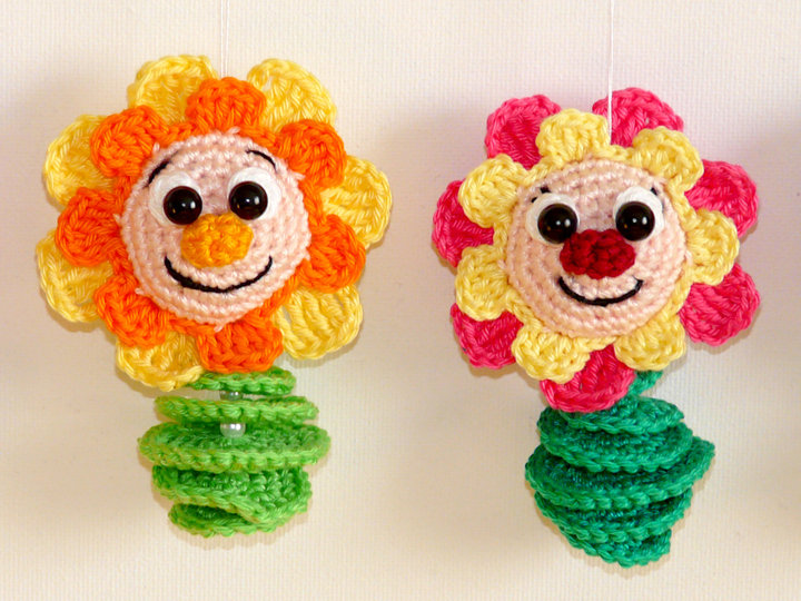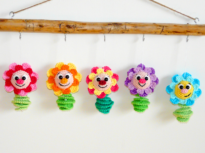 Diese kleinen Blümchenanhänger verbreiten mit ihren bunten Farben und den drolligen Gesichtern richtig gute Laune. Nebenbei vernichten sie noch eure Wollreste :D Hängt euch die Blümchen an den Türkranz oder nehmt sie als Schlüsselanhänger, Taschenbaumler oder Geschenkanhänger. Auch für ein Mobile sind die kleinen Blumen perfekt geeignet.