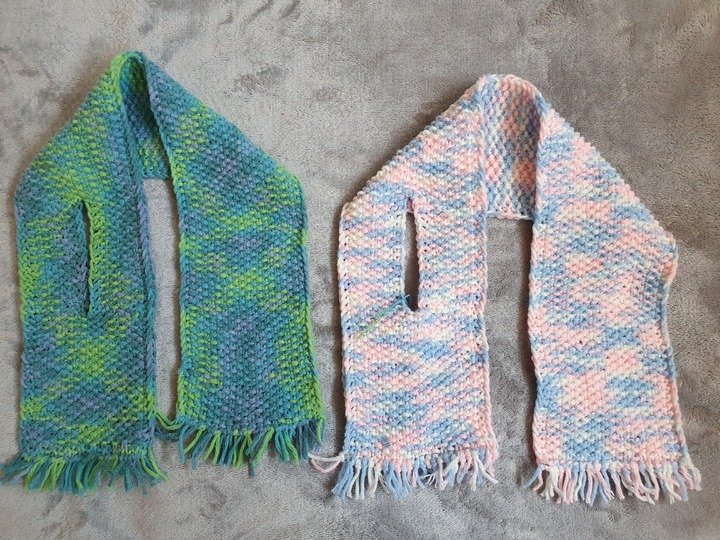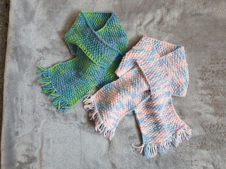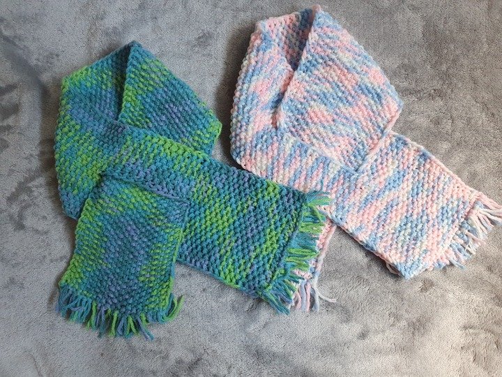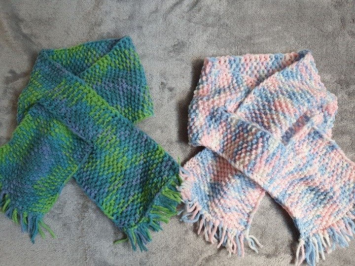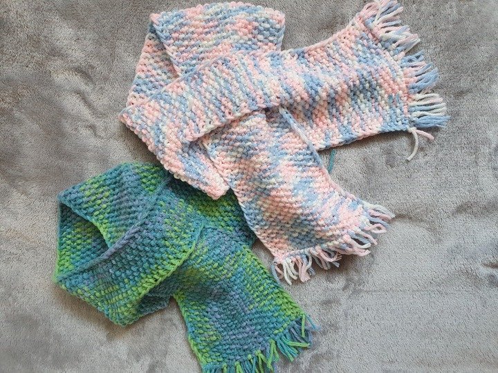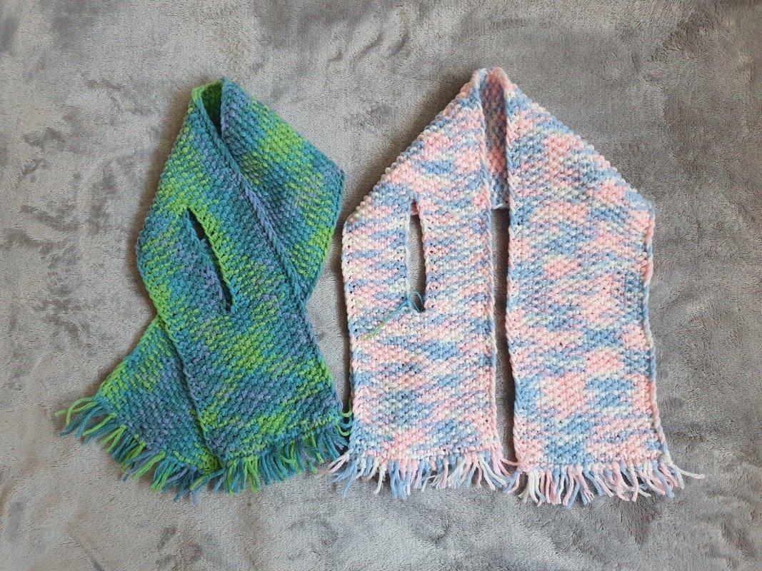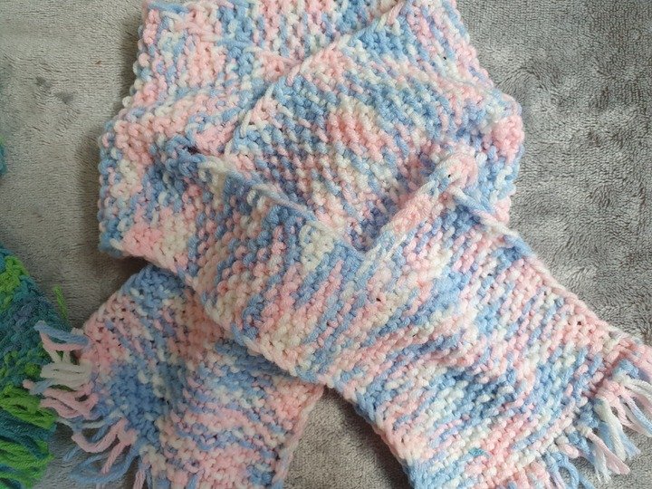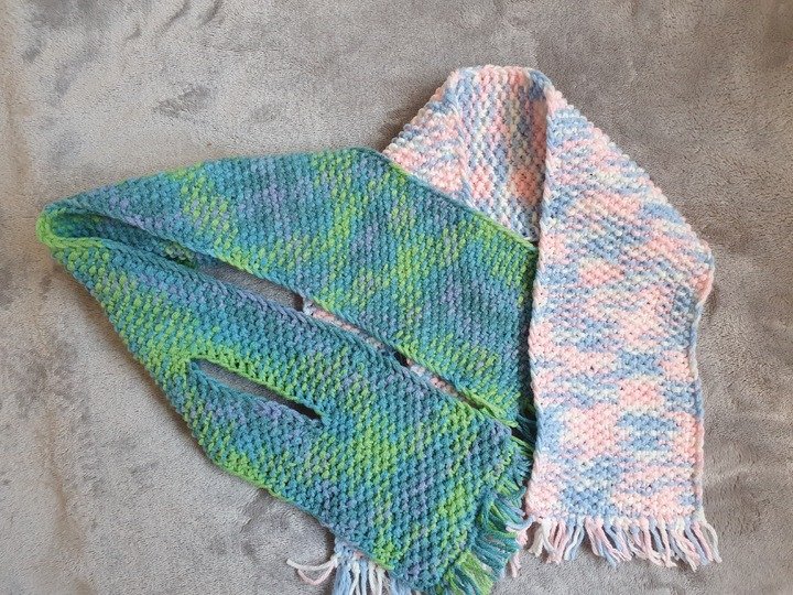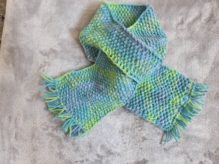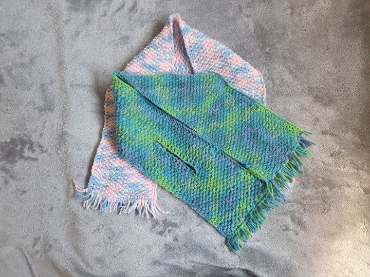 Dieser Babyschal ist kuschelig warm, in einem Stück gestrickt und eignet sich wunderbar um übrig gebliebene Wollreste zu verstricken.