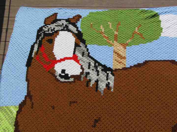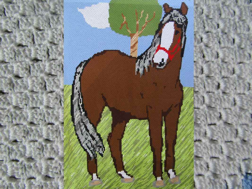 Sie wünschte sich schon lange eine Pferdedecke nach eigenen Entwurf, deshalb habe ich diese Decke nach ihrer Zeichnung für sie gehäkelt.