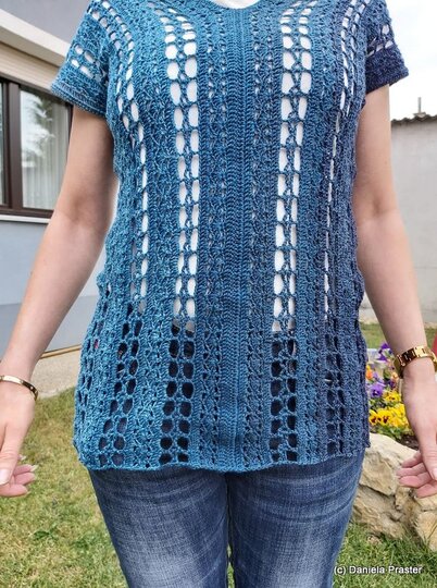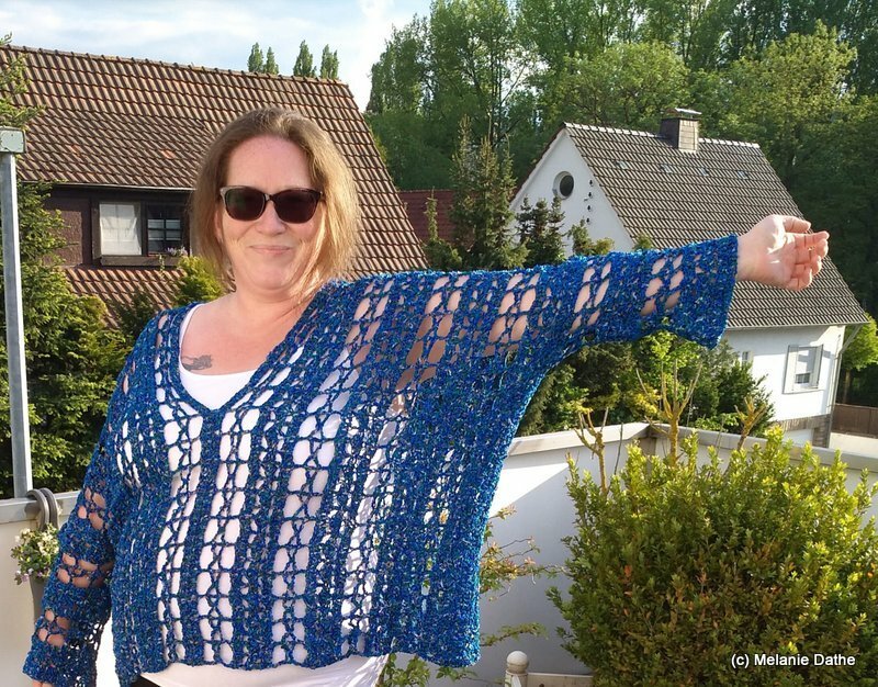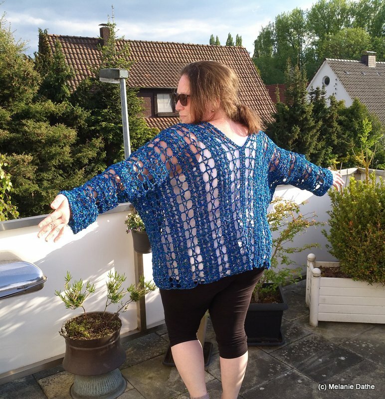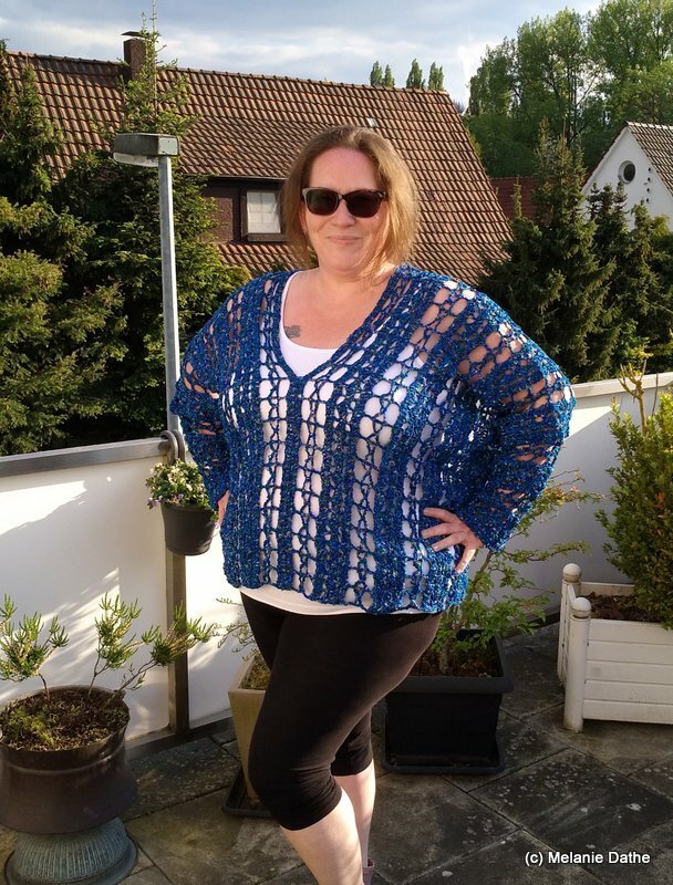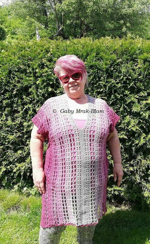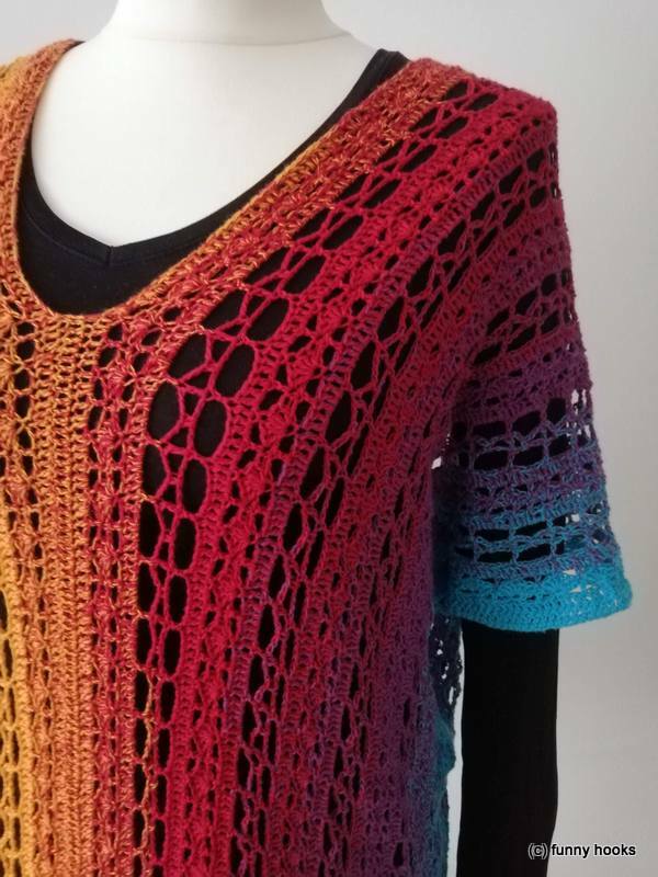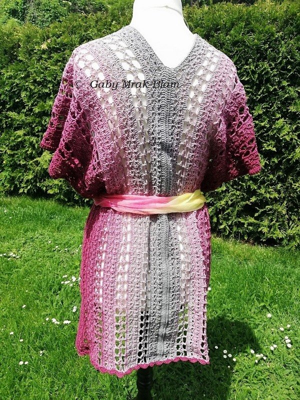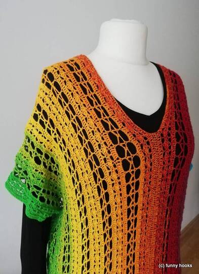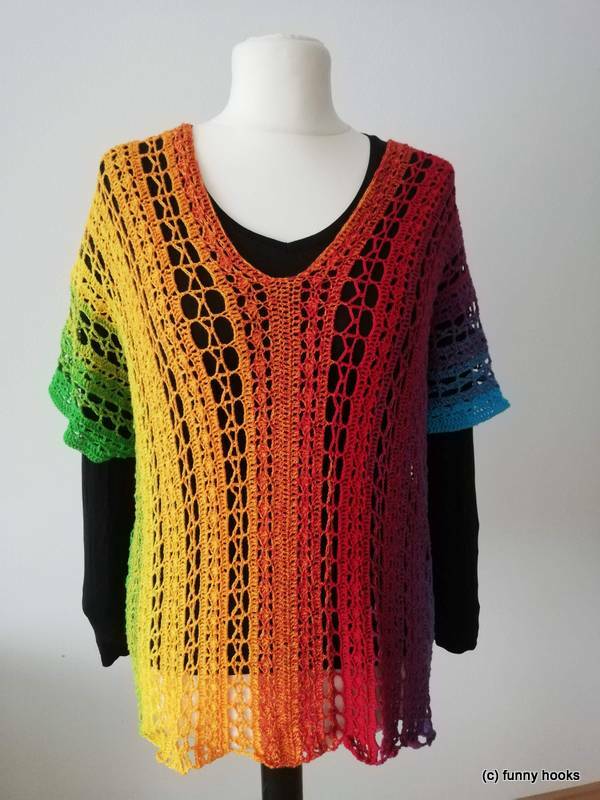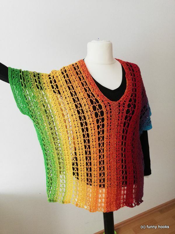 Wie immer ist die Anleitung vielseitig abwandelbar; so kann ein Sommershirt, eine Stola, ein Poncho, ein Kleid oder aber auch ein luftiger Sommerpulli gearbeitet werden.