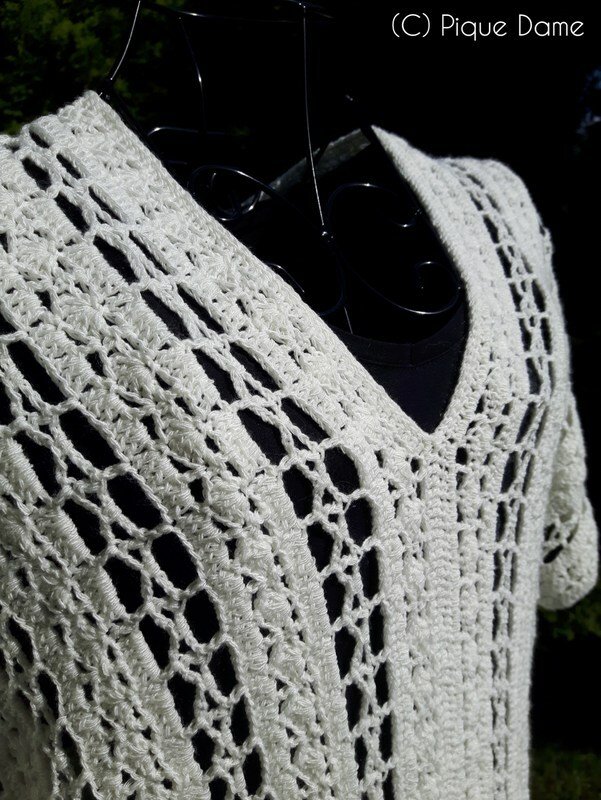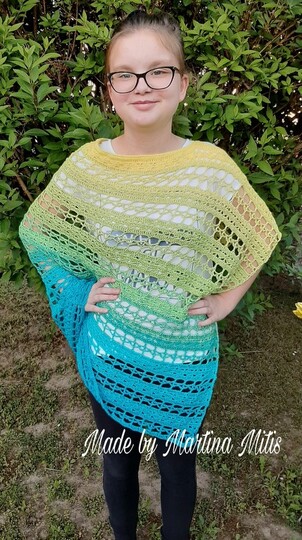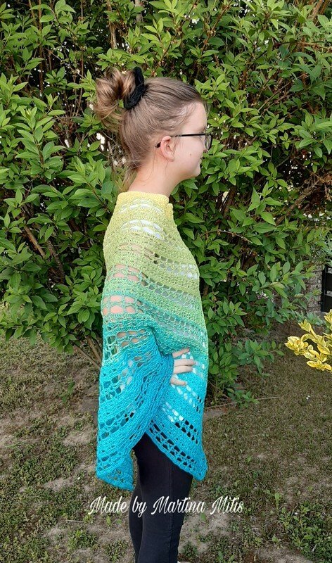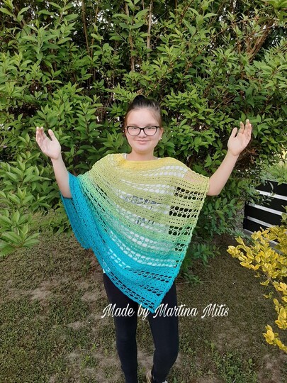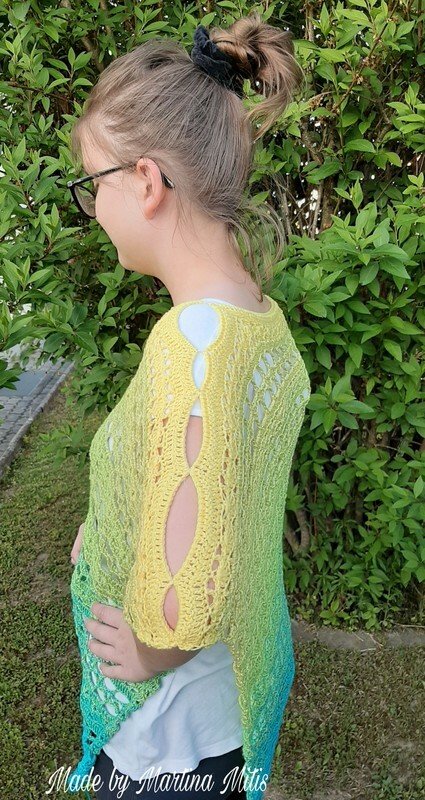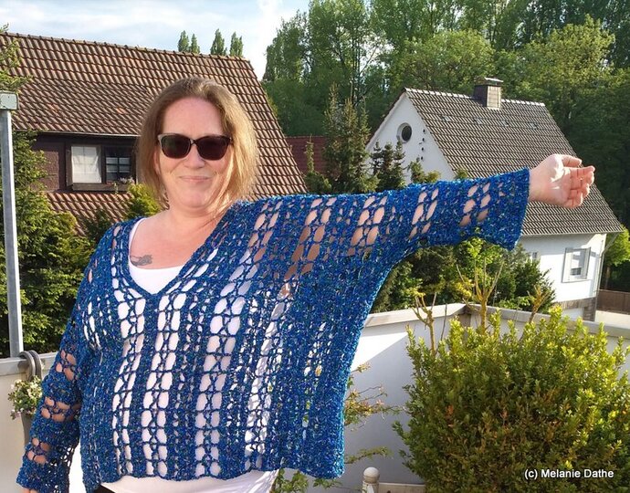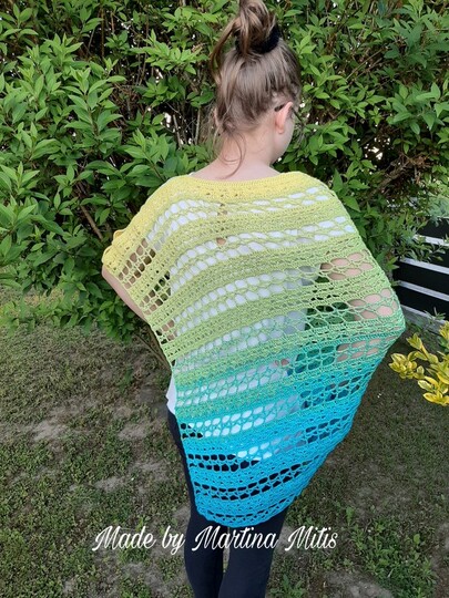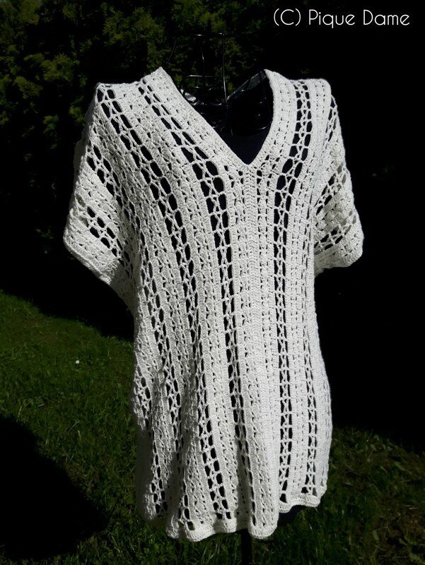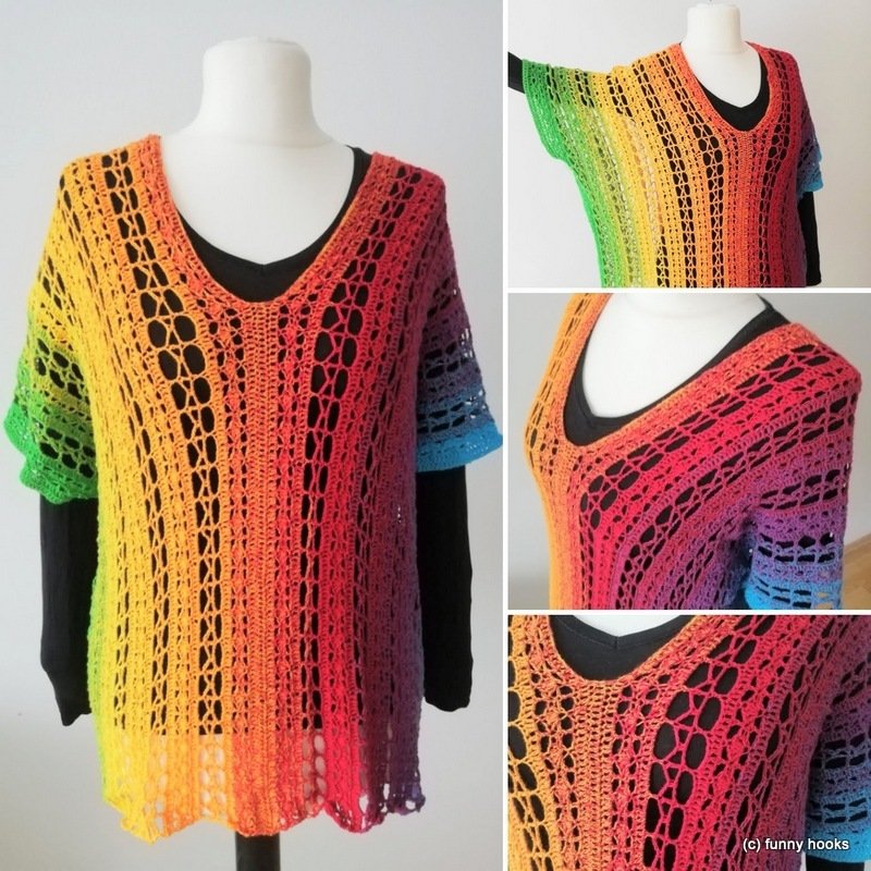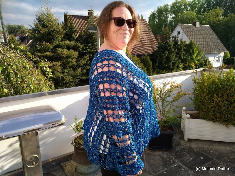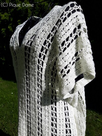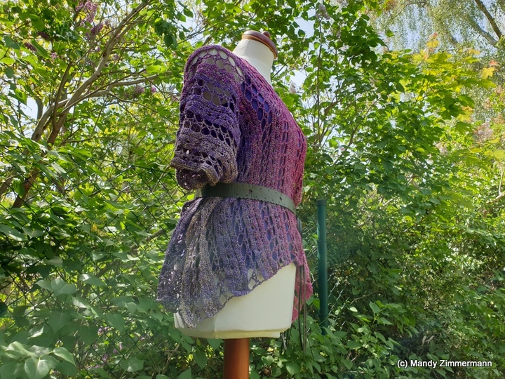 Wie immer ist die Anleitung vielseitig abwandelbar; so kann ein Sommershirt, eine Stola, ein Poncho, ein Kleid oder aber auch ein luftiger Sommerpulli gearbeitet werden.