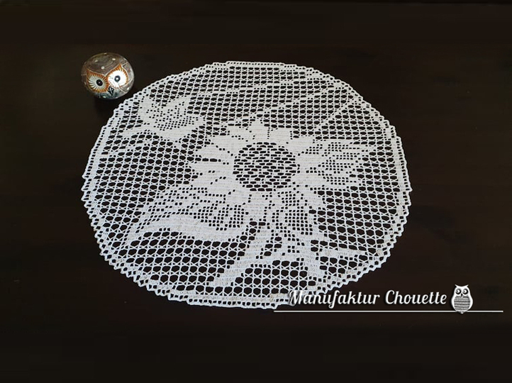 Dieses runde Filetdesign passt auf runde, längliche und dreieckige Tische oder kann auch als Fensterbild den Blick nach draußen verschönern.