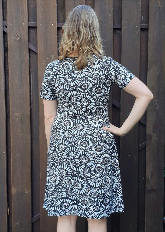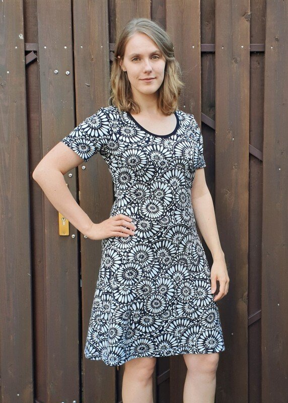 Für das Kleid bieten sich weichfallende, mittelschwere Jerseystoffe an. Bei mittelschweren Stoffen hat das Kleid eine gute Passform. Bei dünnen und sehr weichen Stoffen kann es etwas lockerer sitzen.