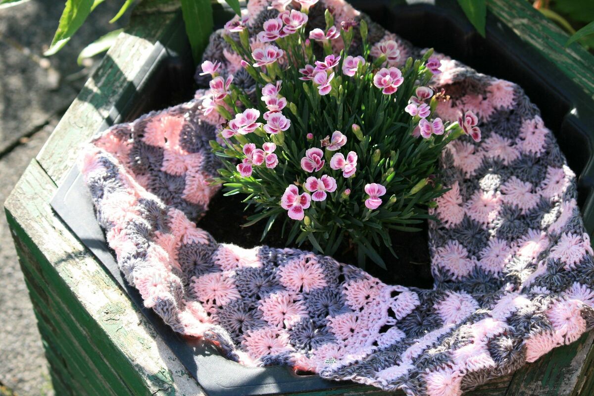 Ich hatte hier zwei bunte Bobbel mit recht wenig Lauflänge, jeder 750m. Die haben mich angeschrien, dass sie endlich verarbeitet werden wollten. Aber mit so wenig Lauflänge fiel es mir schwer, daraus ein Tuch zu machen, da ich zum einen nicht so ewig lange Luftmaschenketten mag, andererseits die Tücher aber gerne größer habe. Also habe ich mir was überlegt, um die Bobbel zufrieden zu stellen, und ein schönes Ergebnis zu haben. Ich habe beide gleichzeitig verarbeitet und herausgekommen ist ein Muster, was mich an eine strahlende Sonne erinnert. Und da der Schal sehr bunt ist, heißt es nun „Buntes Strahlen“ auf Esperanto. Warum Esperanto? Ganz einfach, weil mir da die Übersetzung am besten gefallen hat.