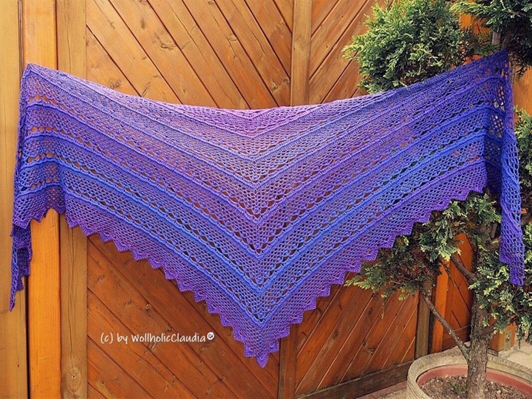 Dieses wunderschöne, sommerliche Tuch entspannt schon beim Häkeln. Es hat ein wiederkehrendes und absolut fernsehtaugliches Muster und das Beste: Die Größe kann individuell bestimmt werden. Es geht sehr schnell in die Breite und schon mit 1000m Garn erreicht man eine beachtliche Spannweite.