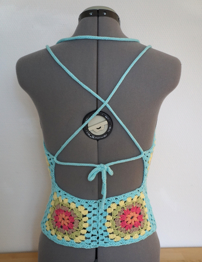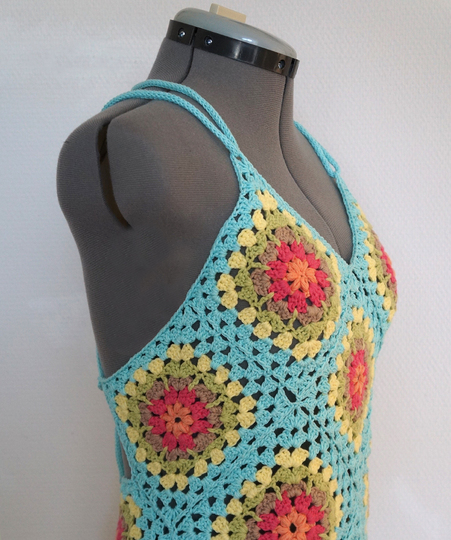 Nett anzusehen sind sie und Grannysquares arbeite ich immer gerne. Daher kommt hier passend zum Sommer ein luftiges Top. Durch die bunten Farben ist das Top nicht extrem durchsichtig, sondern kann auch am Strand über den Bikini gut getragen werden.