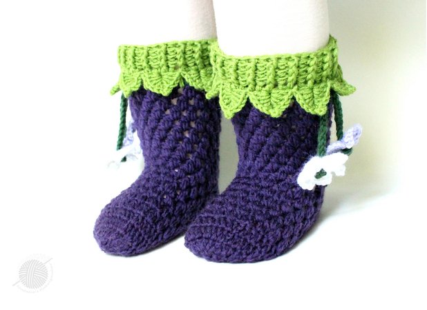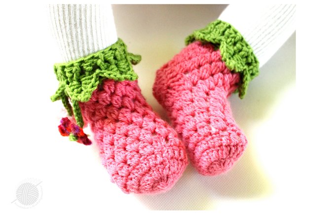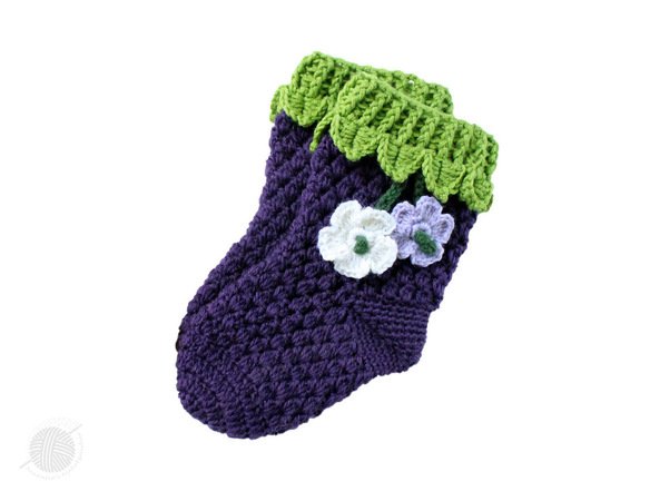 Diese PDF-Häkelanleitung besteht aus bebilderter Anleitung zum Häkeln von Baby- & Kindersocken "Waldbeeren" mit dem Anhänger "Blumen".
