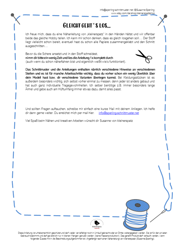 Die Anleitung und das Schnittmusters dürfen nur für private Zwecke genutzt werden. Genähte Produkte dürfen gewerblich vertrieben werden, sofern beim Verkauf darauf hingewiesen wird, dass sie nach einer Anleitung von "kleinerspatz" gefertig wurden. Eine Massenproduktion fertiger Produkte (mehr als 50 Stück eines Schnittes) ist nicht gestattet.