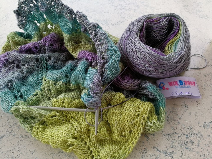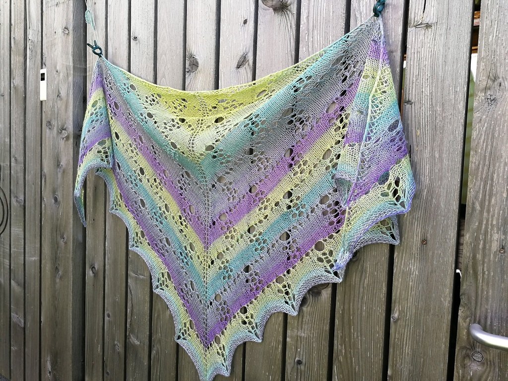 Das beschreibt meine Idee zum Dreieckstuch "Florietta von oben", das eine Erweiterung zu meinem Design "Floraverdi" darstellt. Es ist das Zwillingstuch von "Florietta von der Seite", das ein ähnliches Muster hat aber von der Seite begonnen wird.