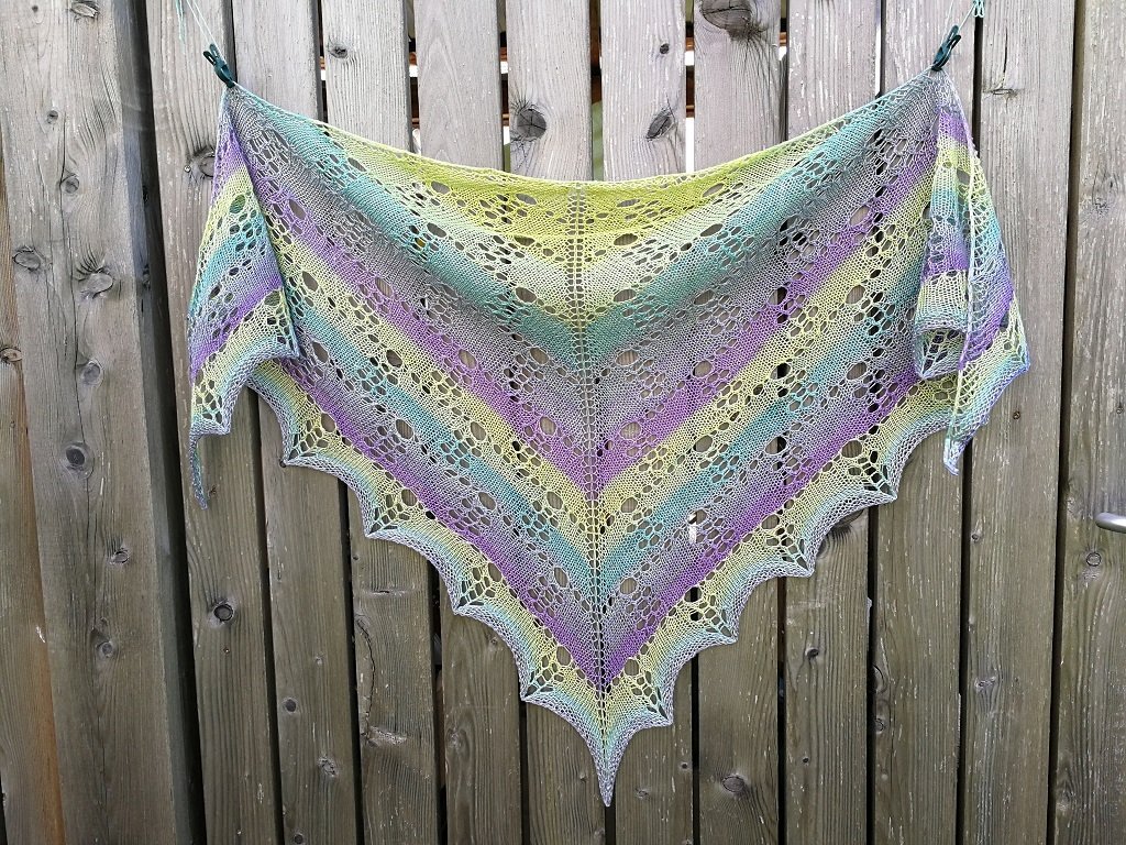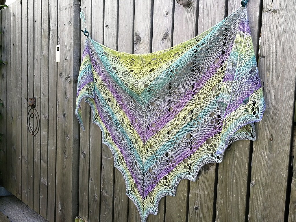 Das Dreieckstuch "Florietta von oben" wird von oben begonnen und in einem durch gestrickt. Die händisch gefärbten Blockstreifen kommen dadurch perfekt zur Geltung und werden durch die Lochmusterreihen und das Blütenmuster aufgewertet.
