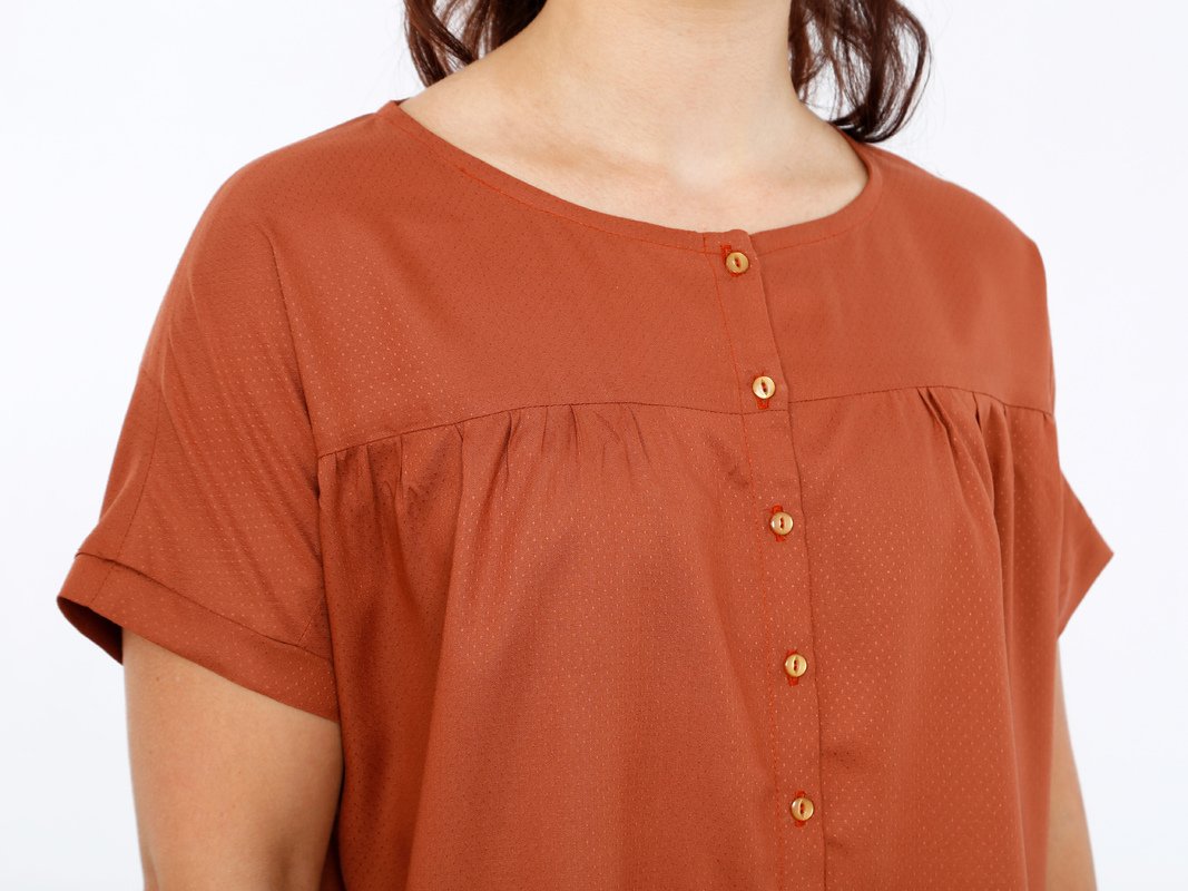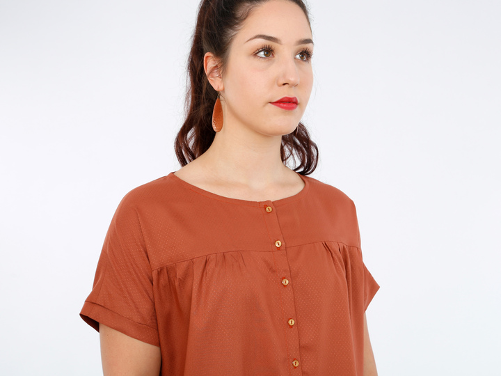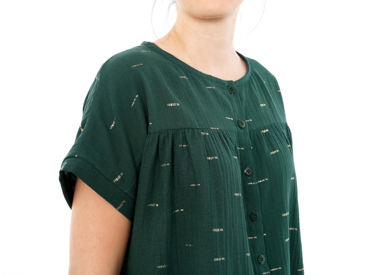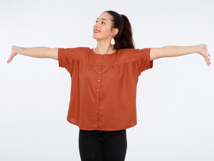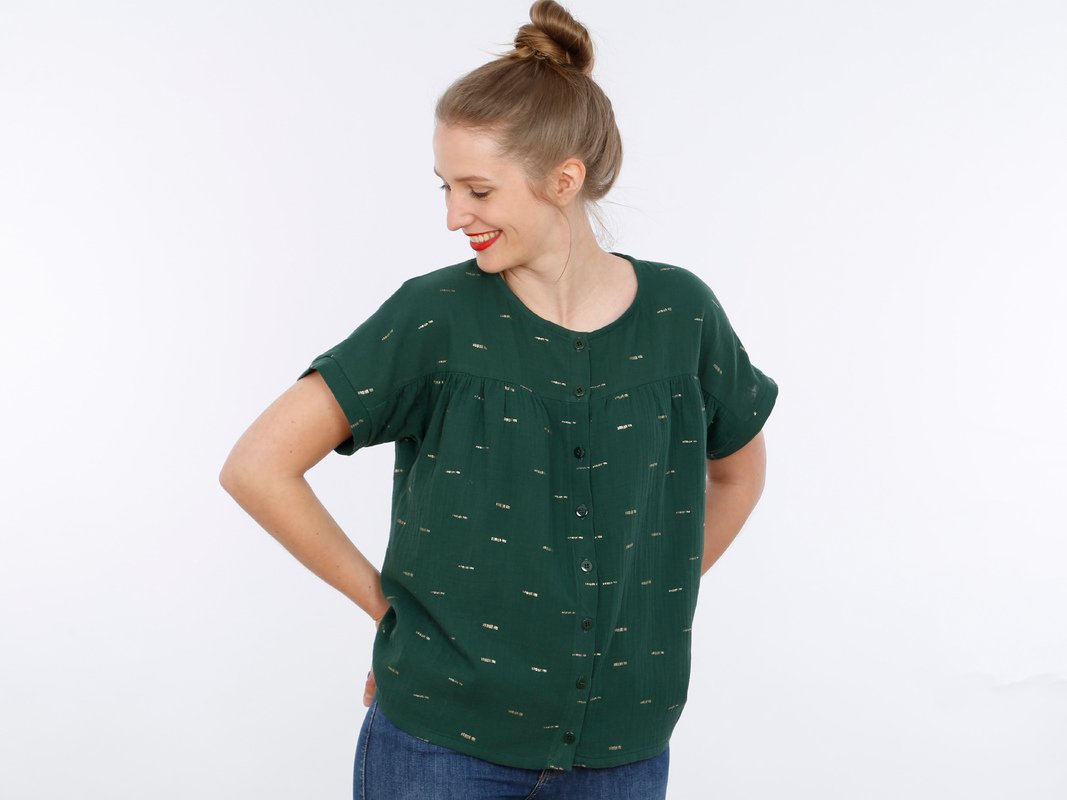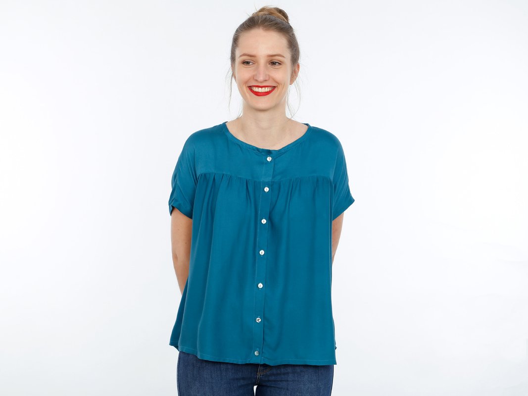 FRAU SUZY schafft den Spagat zwischen lässig und romantisch mit Leichtigkeit! Die luftige Bluse mit kurzem Fledermausärmel erzeugt durch eine Kräuselung in Vorder- und Rückenteil eine angenehme Weite. Mit der Knopfleiste in der vorderen Mitte, dem Rundhalsausschnitt und dem Ärmelabschluss, ist sie perfekt für Büro oder Party.