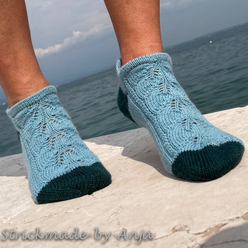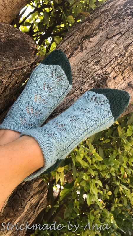 In dieser Anleitung ist das erhöhte Bündchen, die Shadow Wrap Ferse und die Bandspitze beschrieben. Es kann aber beliebig ausgetauscht werden.