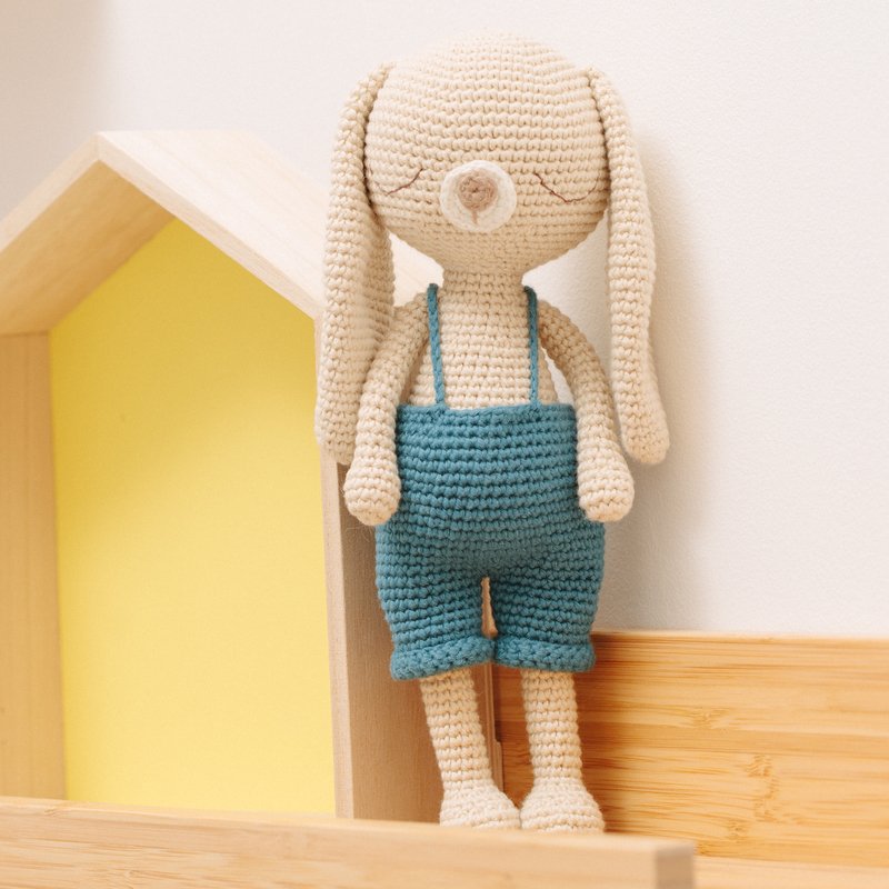 Wenn du dasselbe Garn und dieselbe Häkelnadel verwendest wie ich, wird das Häschen ca. 22,5 cm (8,8 Zoll) groß. Du kannst es größer oder kleiner machen indem du ein anderes Garn benutzt, passe aber dann die Häkelnadel und die Sicherheitsaugen entsprechend an.