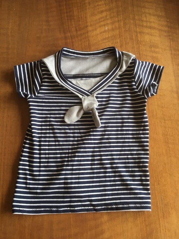 Vorn mit V-Ausschnitt und einem Kragen mit Knoten - hinten mit „Fake“-Kragen im Look eines echten Matrosenshirts.