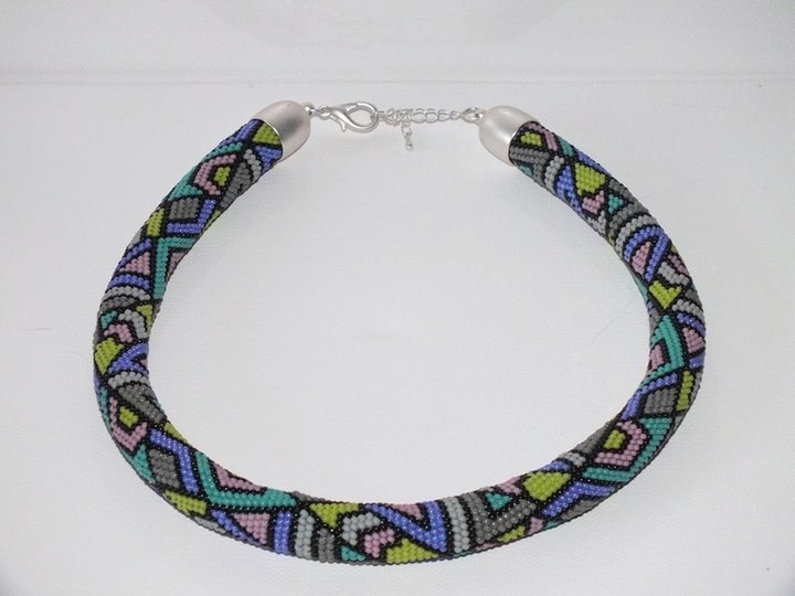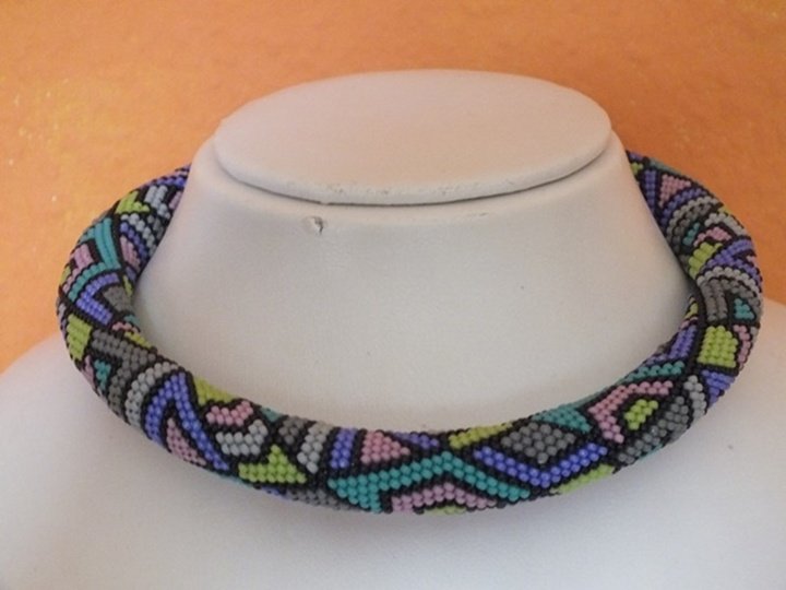 Mit Hilfe dieser Anleitung kann mit Rocailles die Halskette mit graphischem Muster gehäkelt werden.