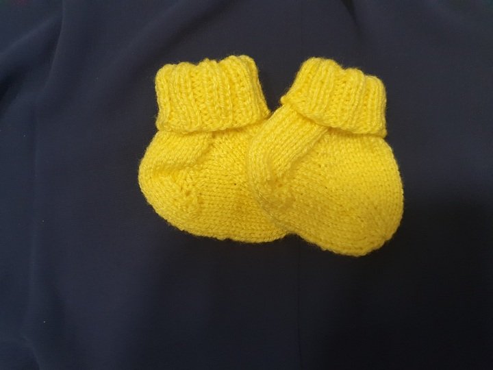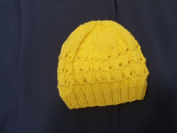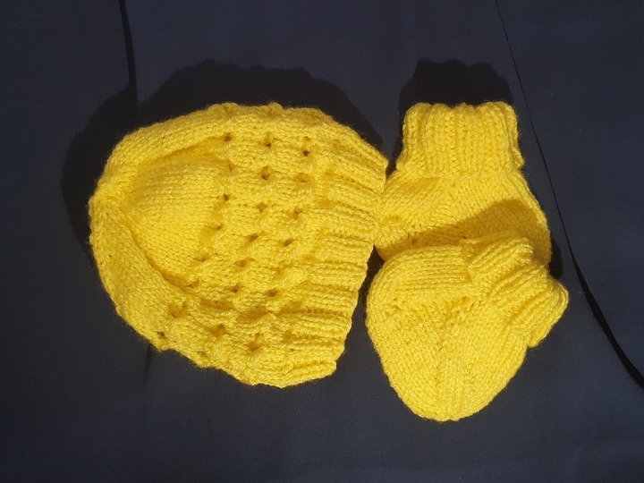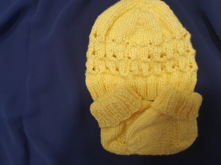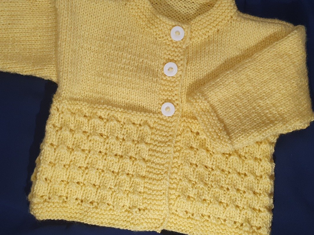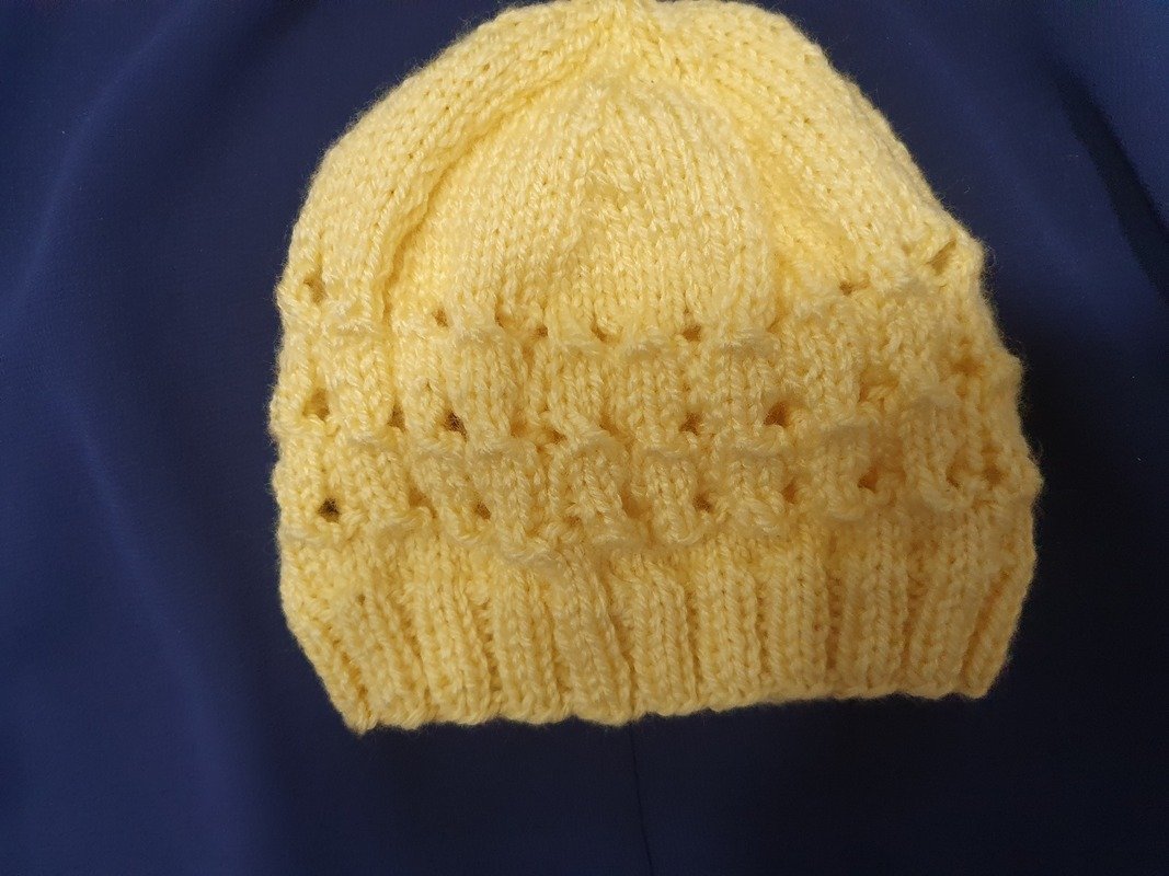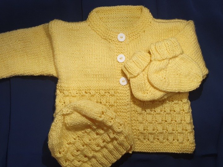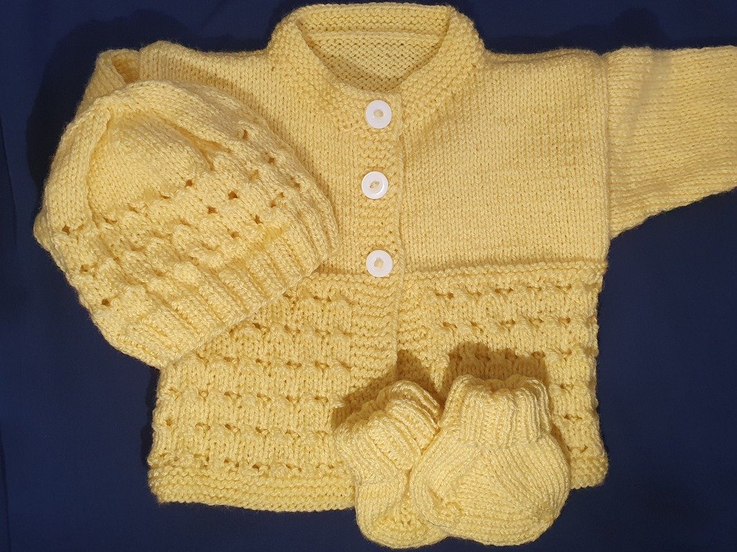 Strickanleitung für ein wunderschöne 3-teilige Babygarnitur für Größe 68/74 in der Farbe gelb.