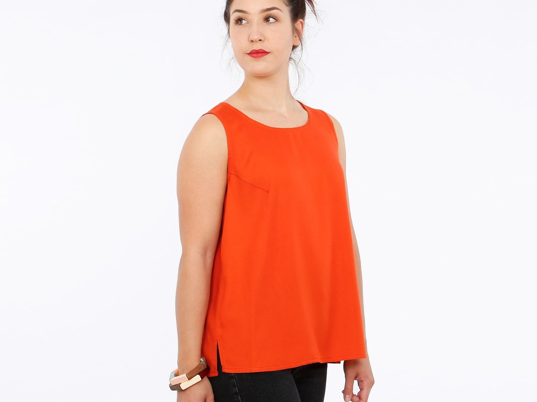 FRAU MERLE fühlt sich wohl, wenn die Temperaturen steigen. Das Top mit Rundhalsausschnitt und leichter A-Form ist ideal für heiße Tage. Die ins Armloch gedrehten Brustabnäher sorgen für den perfekten Sitz und die kleinen Schlitze in der Seitennaht für lässige Weite. Die breiten Träger laufen bis ins Rückenteil und sorgen mit den schrägen, verlegten Schulternähten dafür, dass auch die Rückenansicht ein feines Detail bekommt.