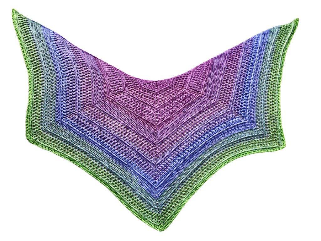 Ich empfehle einen Farbverlaufsbobbel (ob 3- oder 4-fädig ist egal) mit mindestens 1000m Lauflänge, wer gerne große Tücher mag dem empfehle ich eher zu 1500m zu greifen. Dazu eine passende Häkelnadel.