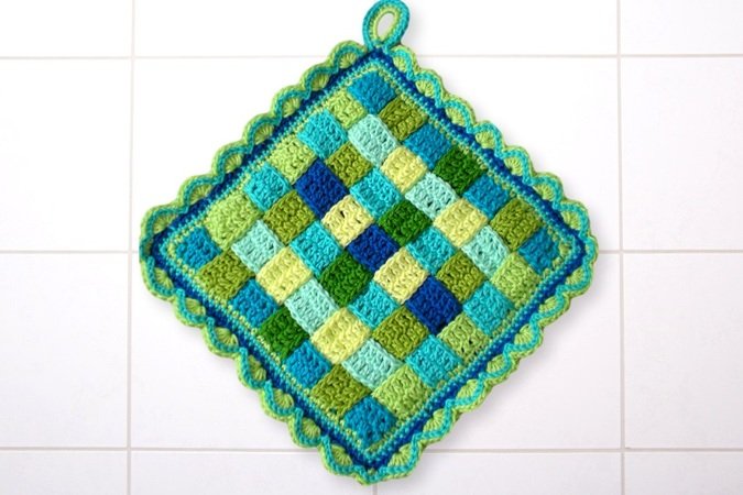 Mit Luftmaschen, Kettmaschen, festen Maschen, halben und normalen Stäbchen häkeln kannst du den Topflappen ruck-zuck nachhäkeln.