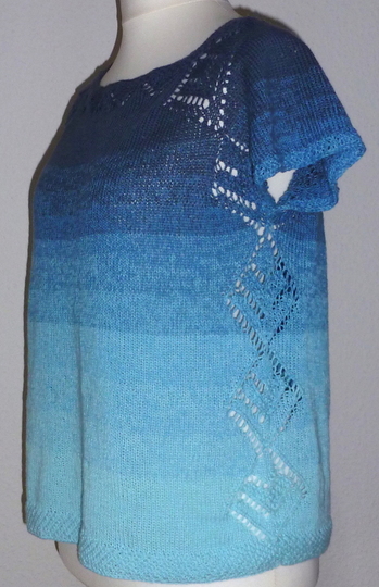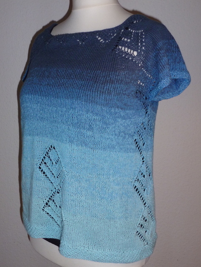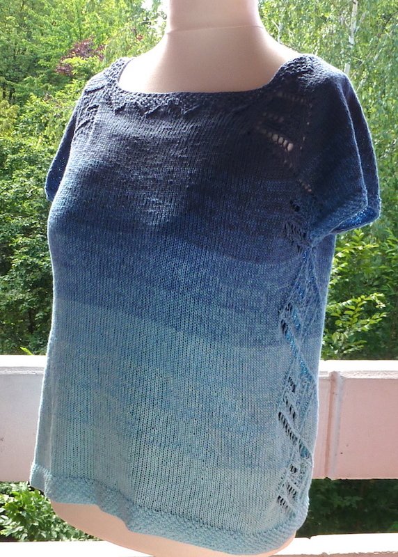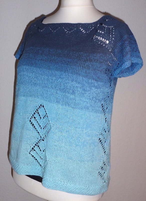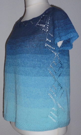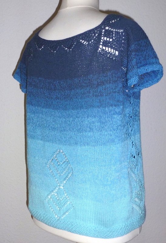 Die Zunahmen verbergen sich im Muster, das später an den Seiten aufgegriffen wird und nach Wunsch auch im Vorder- oder/und Rückteil.