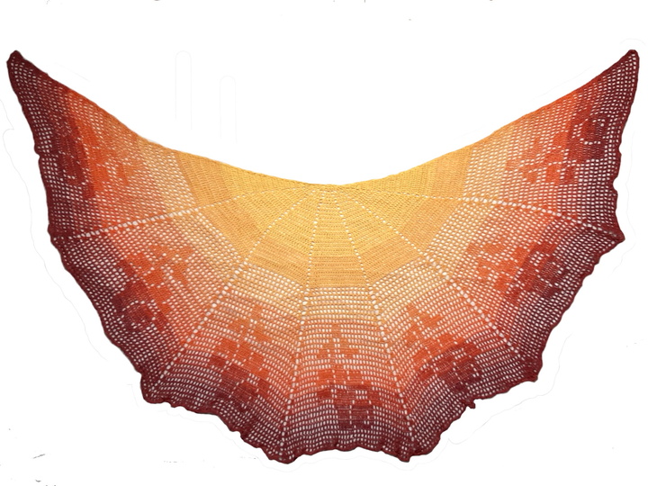 Laß es Rosen regnen! Das halbrunde Motivtuch mit Rosen startet mittig in der oberen Kante mit Stäbchen und wird später in Filettechnik in Hin- und Rückreihen fortgesetzt. Das Rosenmotiv wird jeweils 1x in jedem der sieben Abschnitte gehäkelt. Somit trägst Du einen Strauß mit 7 Rosen um Deine Schultern.