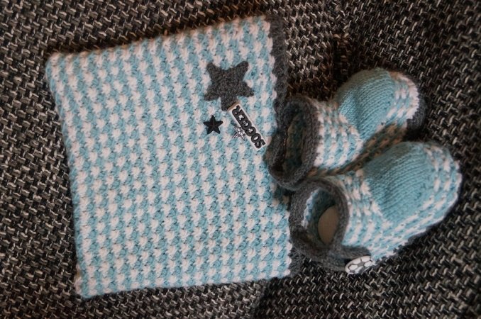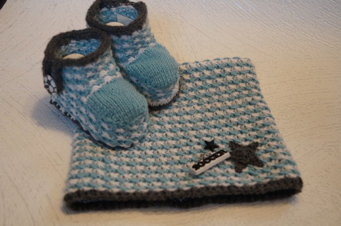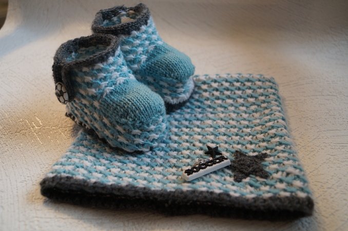 Kleine Sternchen so ist der Name des Musters aus dem die Schuhe und die niedliche Mütze gestrickt sind. Es ist ein wunderschönes Muster dass mit 2 verschiedenen Farben gestrickt besonders toll zur Geltung kommt. Ich habe das Set für einen kleinen Jungen gestrickt, aber natürlich ist es in Mädchenfarben und mit Herzchen oder Blümchen verziert genauso auch für kleine Mädels geeignet.
